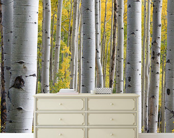 Description: A dresser in front of a wall with a forest of trees behind it and a wall mural behind it.