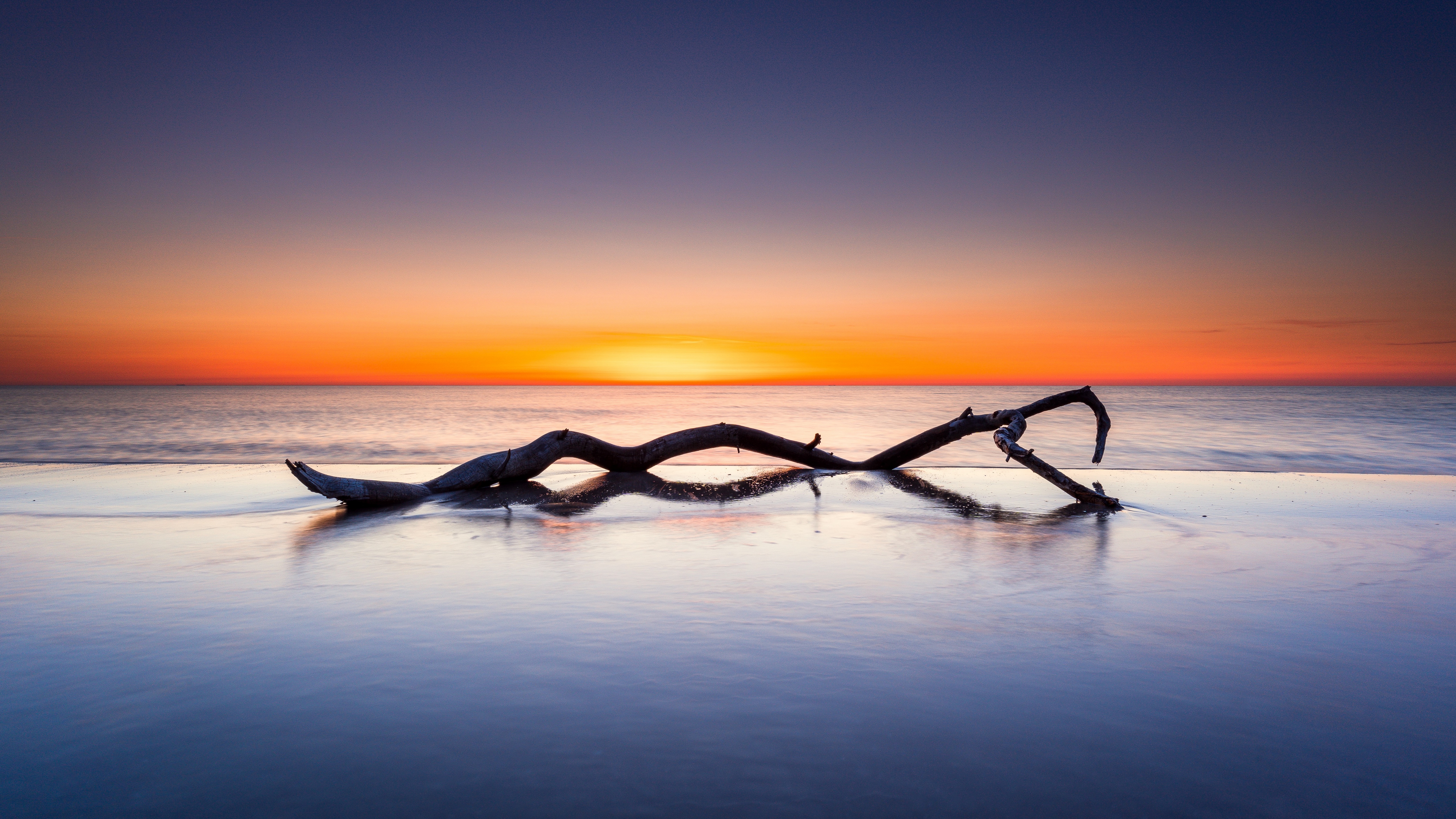 Description: A piece of driftwood sitting on the beach at sunset or dawn with the sun setting in the background.