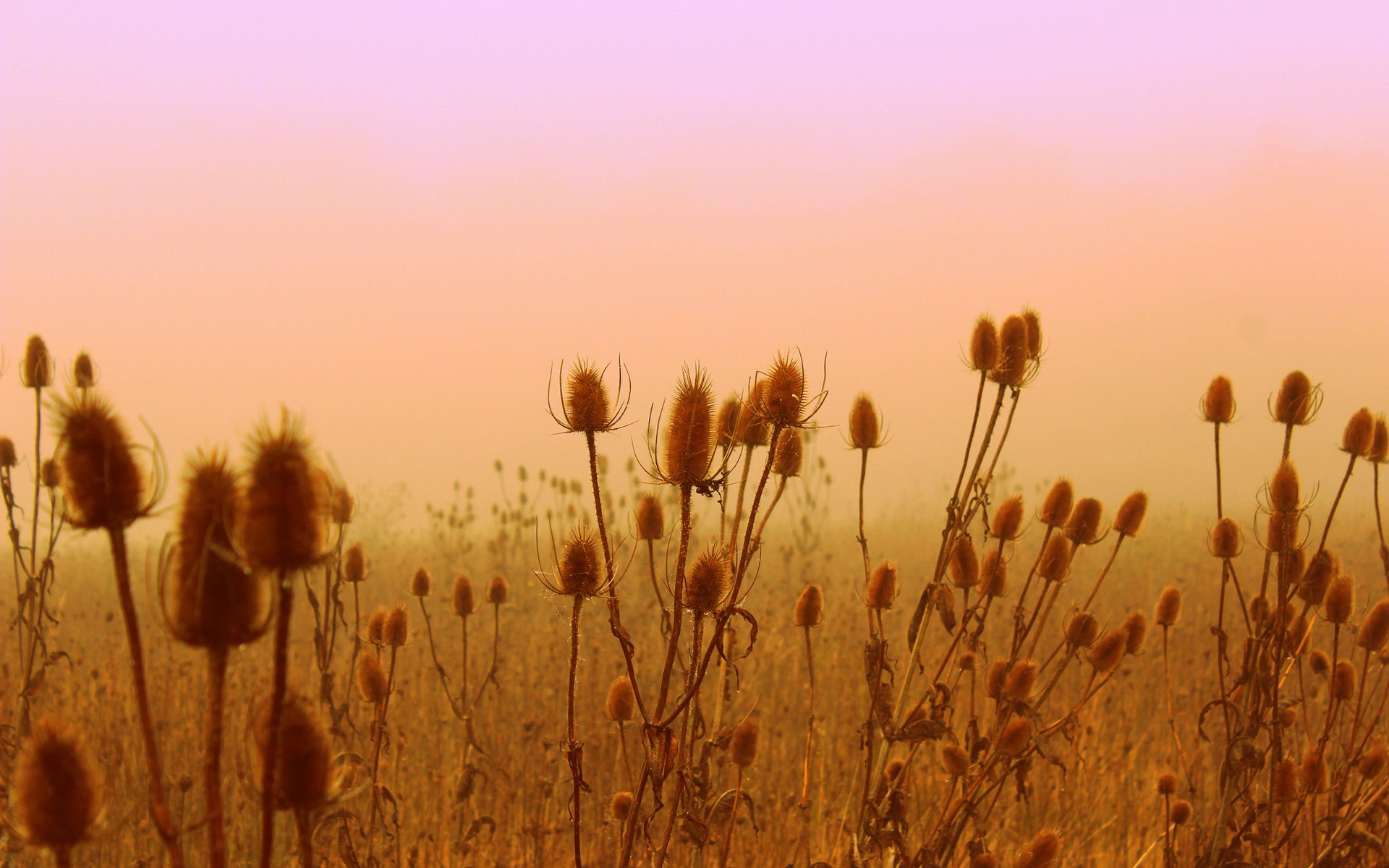 Description: A field with a bunch of tall dry grass in the foreground and a pink sky in the background.