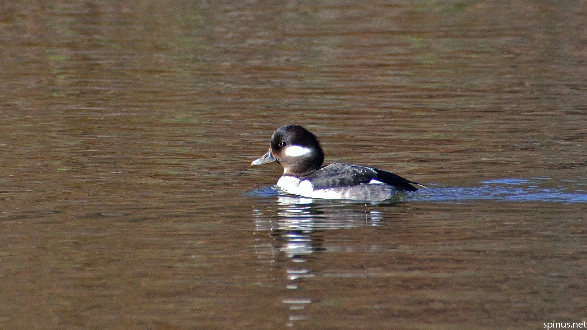 Description: A duck is swimming in the water near the shore of a lake with brown water and green grass in the background.