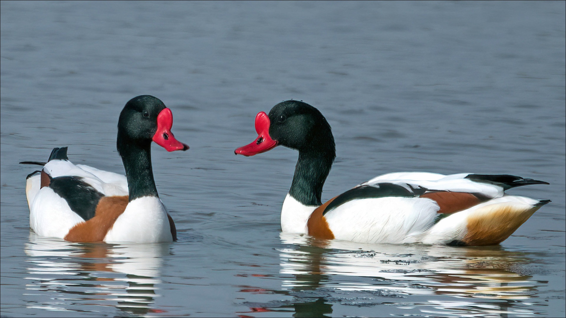 Description: Two ducks are swimming in the water together.