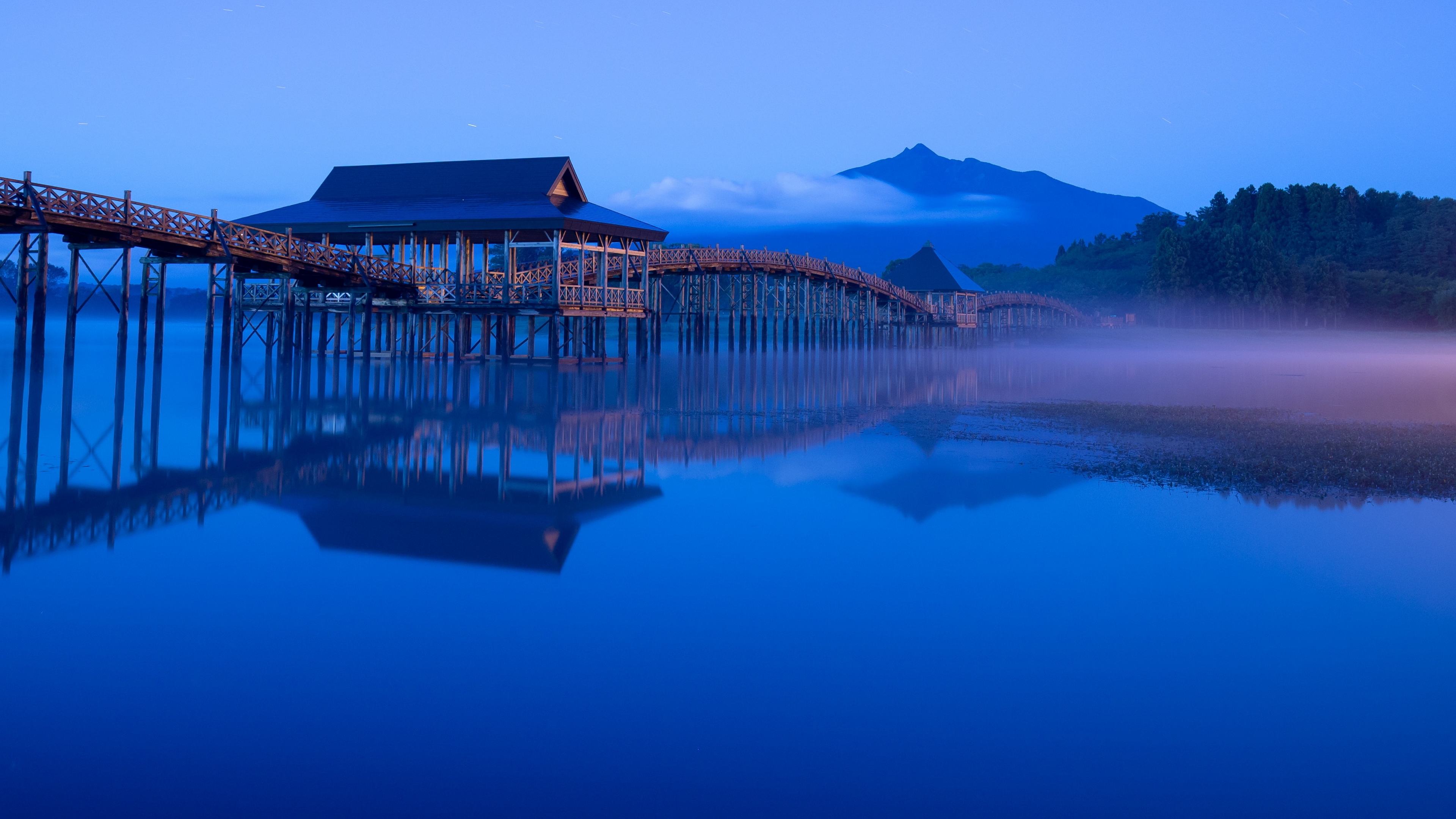 Description: A dock with a house on it and a mountain in the background at dusk with fog in the air.