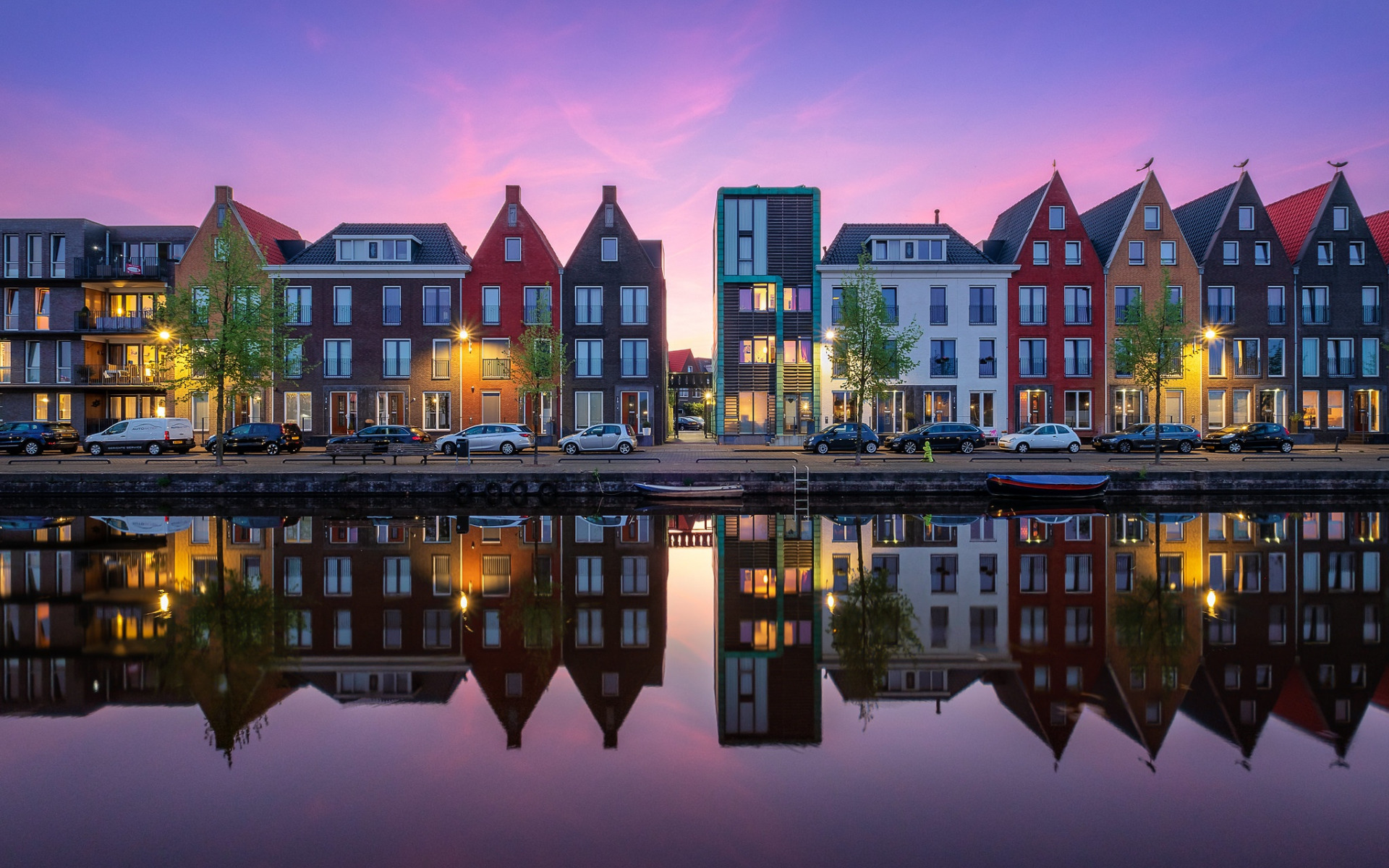 Description: A row of houses next to a body of water at dusk with a boat in the water and a row of parked cars.