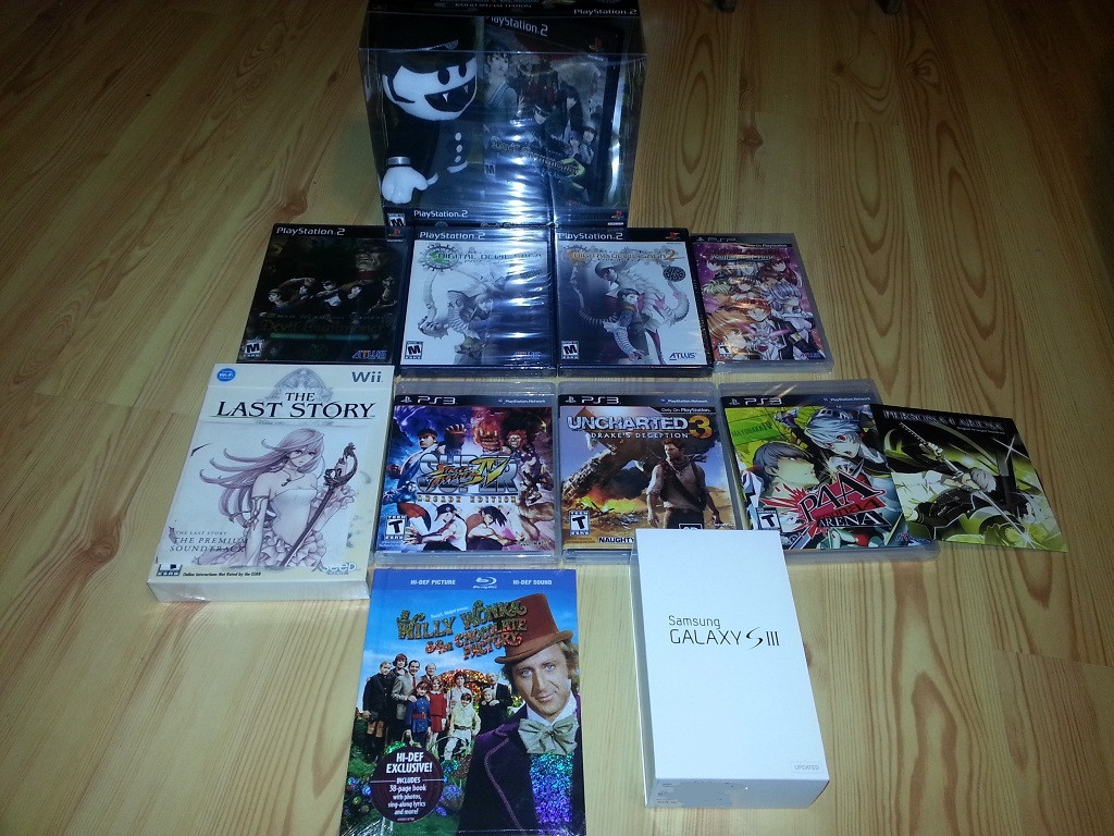 Description: A table with a bunch of dvds and a book on it with a wooden table top in the background.