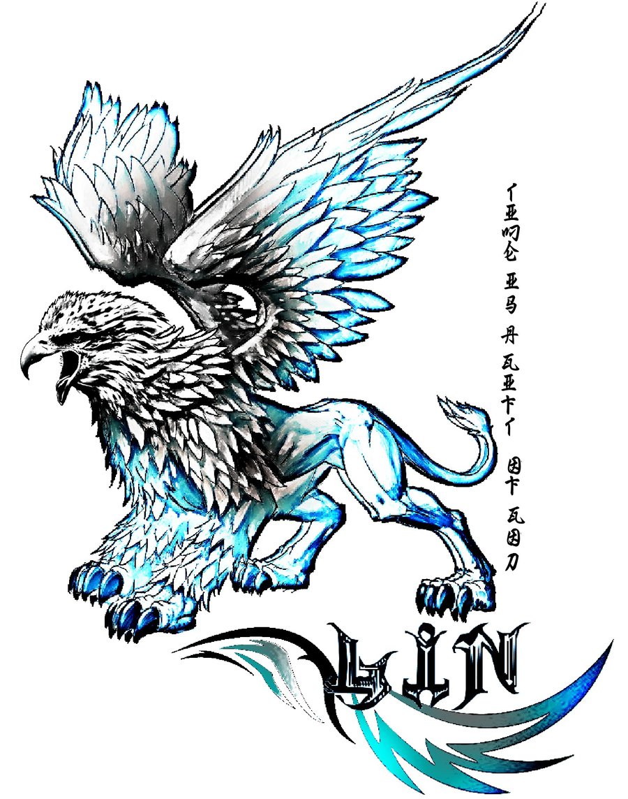 Description: A drawing of an eagle with a lion on it's back and wings flying above it.