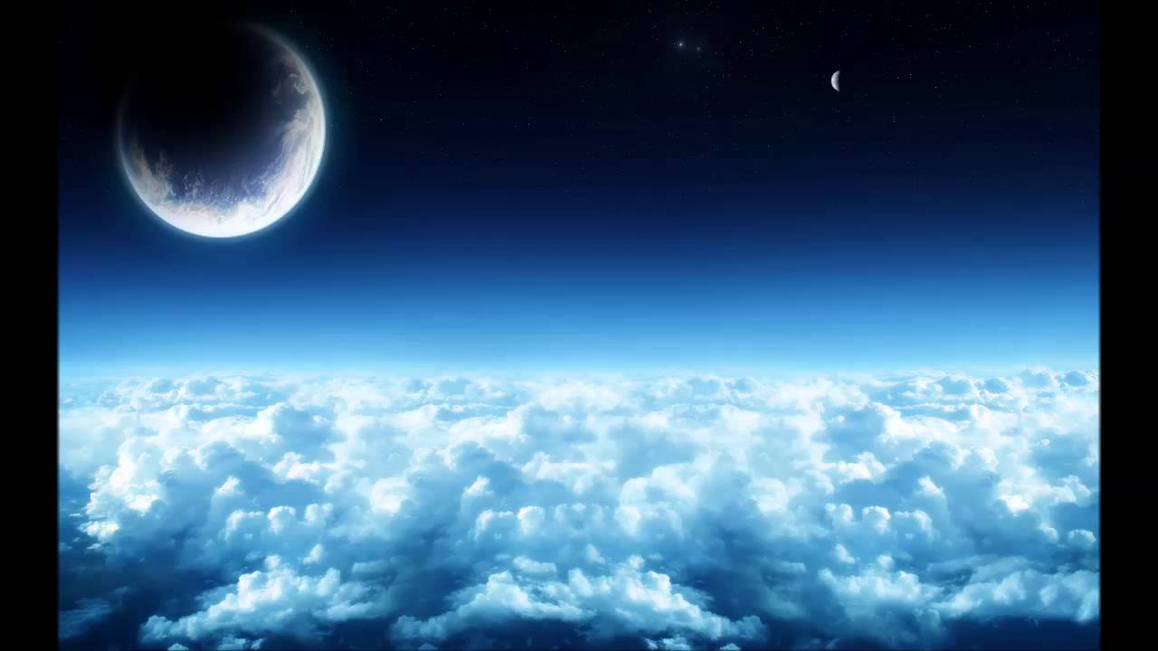 Description: A view of the earth and moon from a plane window at night time with clouds below it and a bright moon in the sky.