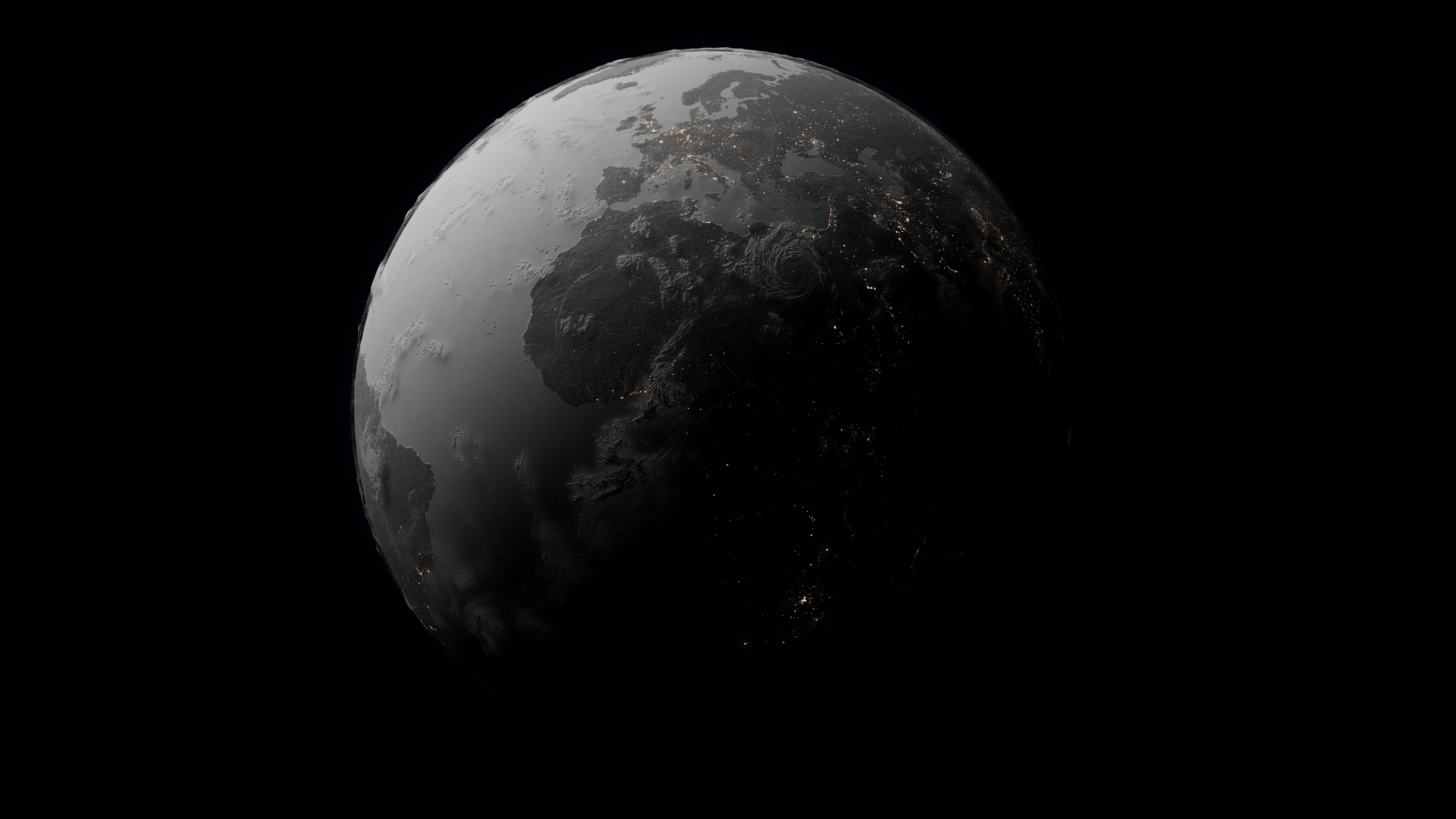 Description: A black and white photo of the earth in space with stars in the sky and a dark background with a black background.