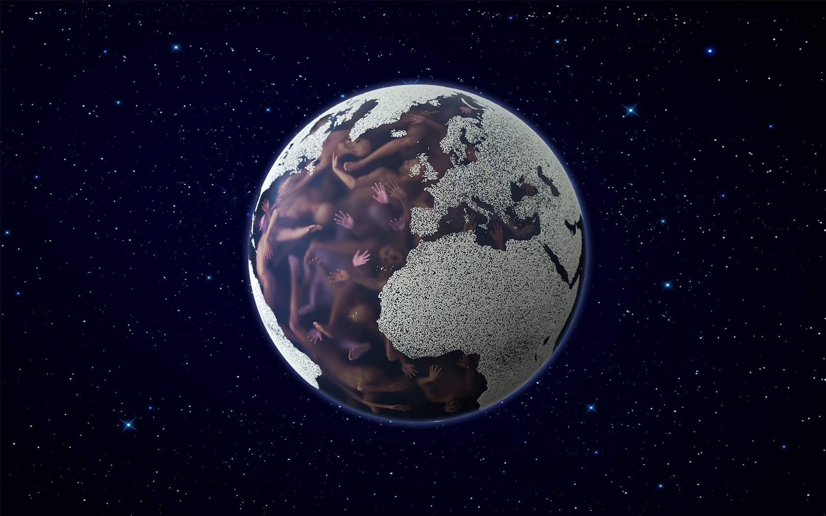 Description: A picture of a planet with a lot of people on it in the middle of the night sky with stars.