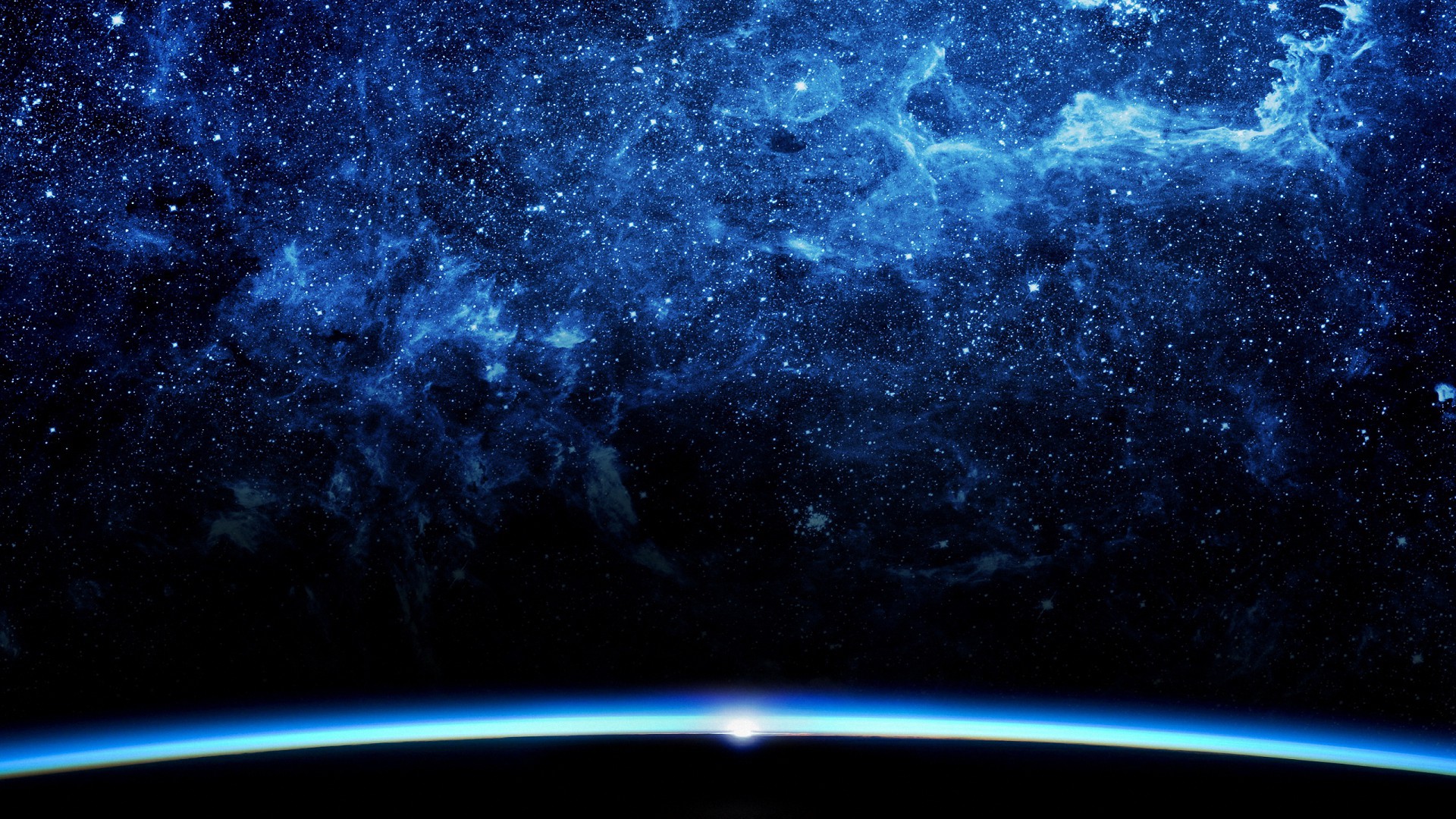 Description: A view of the earth from space with stars in the background and a bright light shining on the horizon.
