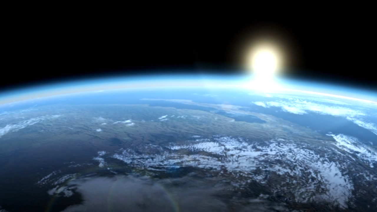 Description: A view of the earth from space with a bright light shining on it's side and a bright light in the middle of the picture.