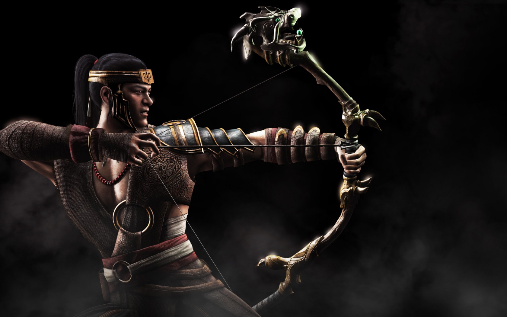 Description: A man dressed in egyptian clothing holding a bow and arrow in his hands and a snake on his shoulder.