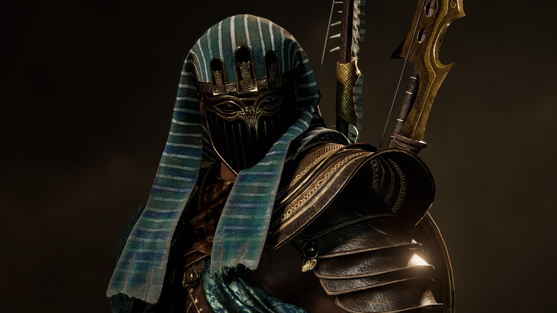 Description: A statue of an egyptian warrior holding a sword and a shield with a glowing eye on it's face.