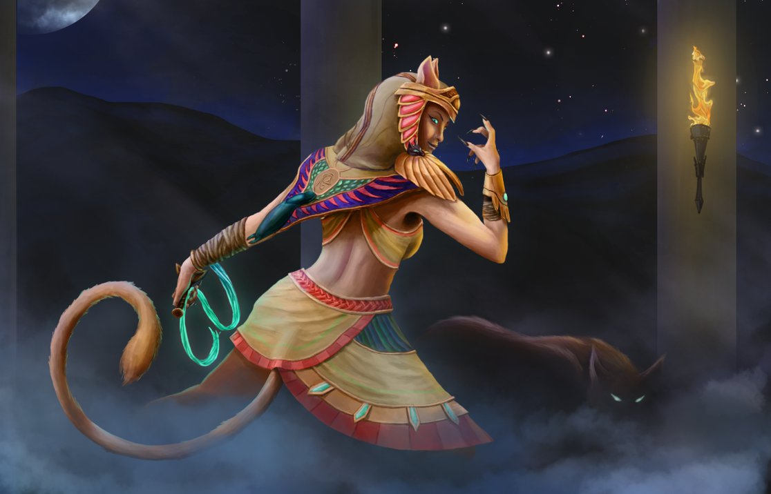 Description: A woman dressed in egyptian clothing holding a fire stick in her hand and a cat in her other hand.