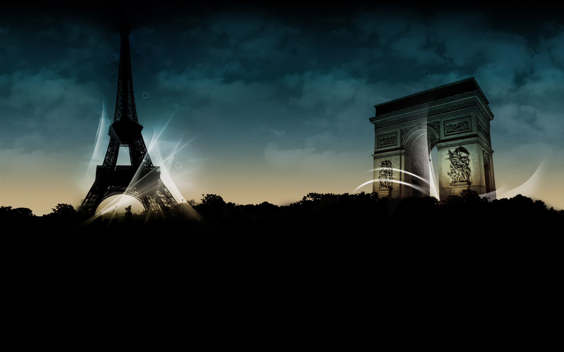 Description: A picture of the eiffel tower in the dark sky with a light trail coming out of it.