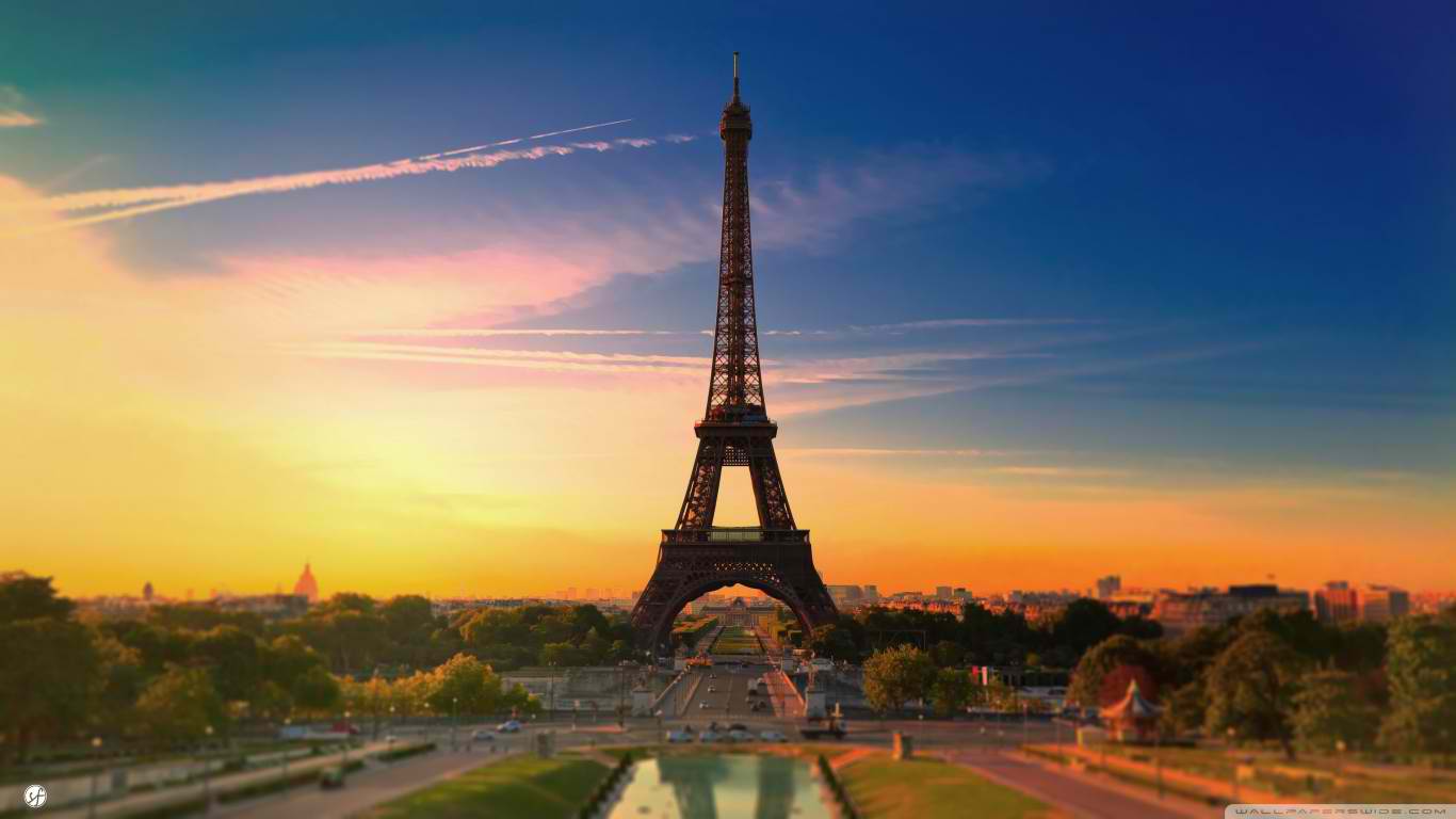 Description: A picture of the eiffel tower in paris at sunset time with a reflection of the sun in the water.