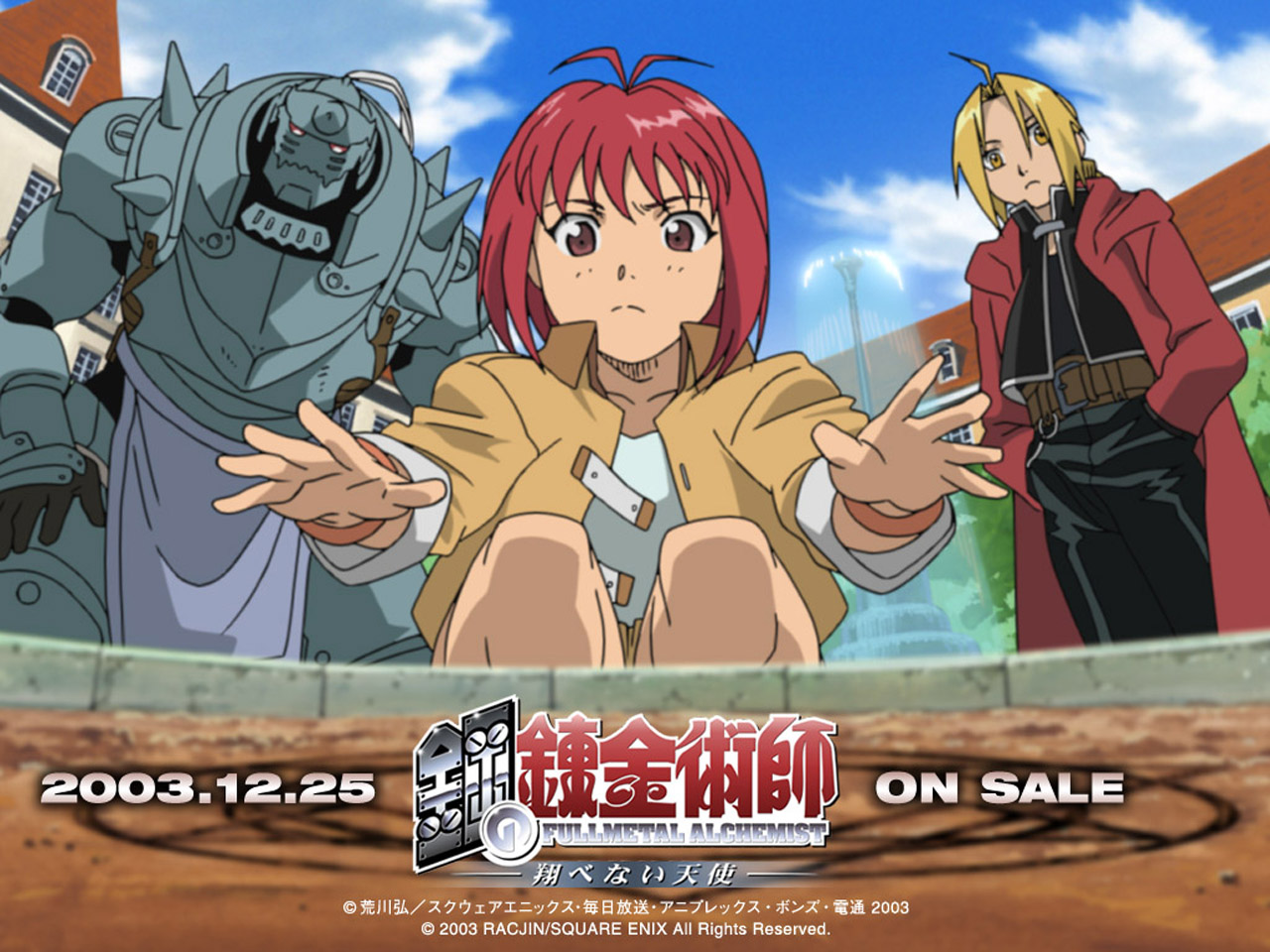 Description: A group of anime characters standing next to each other in front of a building with a sky background and a sign that says.