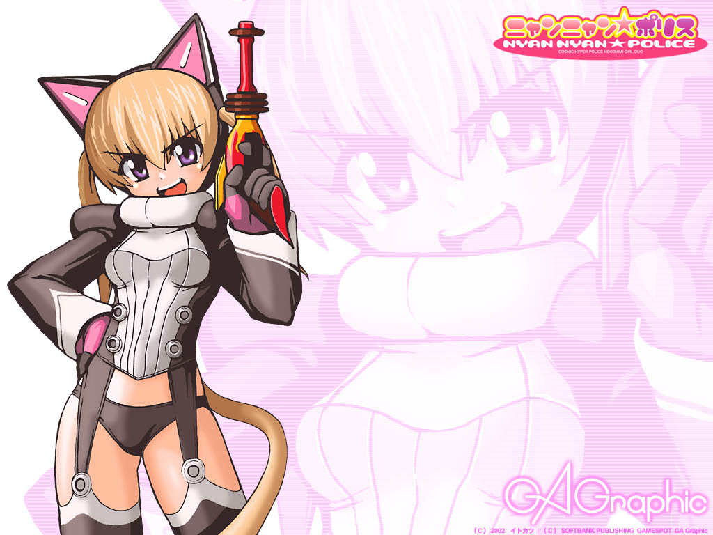 Description: A cartoon character holding a sword and a cat costume on her chest and a cat tail on her head.