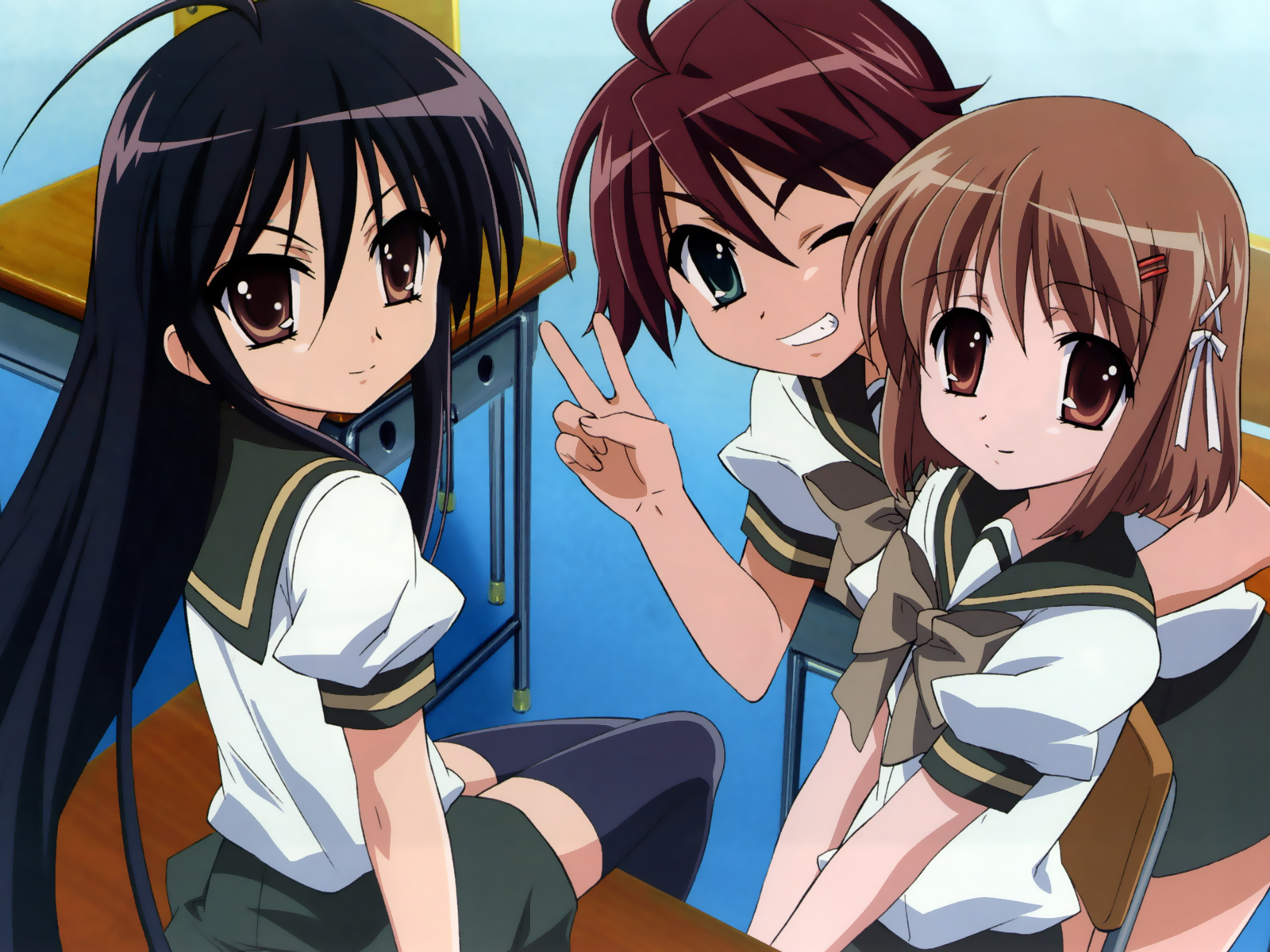 Description: Two girls sitting at a desk in a classroom with one pointing at the other side of the room with her hand up.