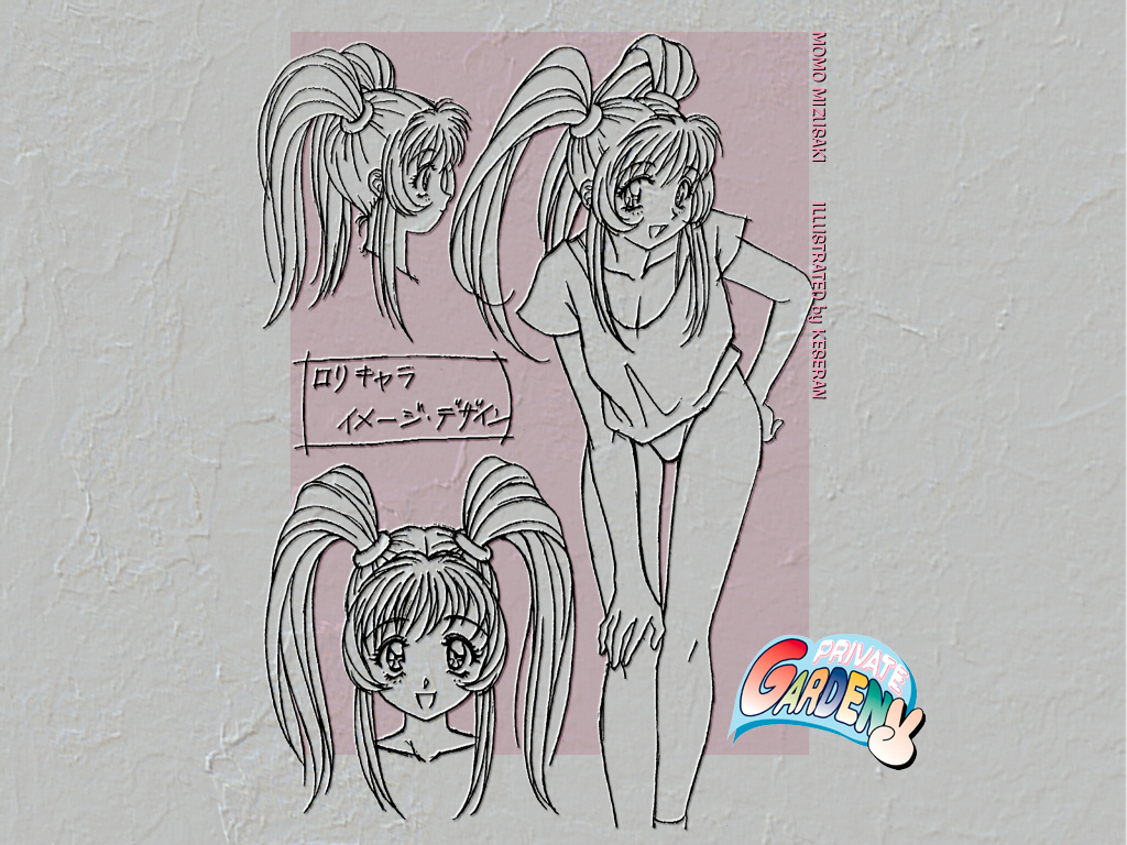 Description: A drawing of a girl with long hair and a ponytail in three different poses.