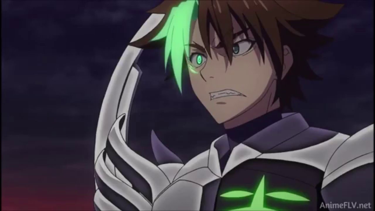 Description: A man with green hair and a black outfit with a sword in his hand and a green light on his face.