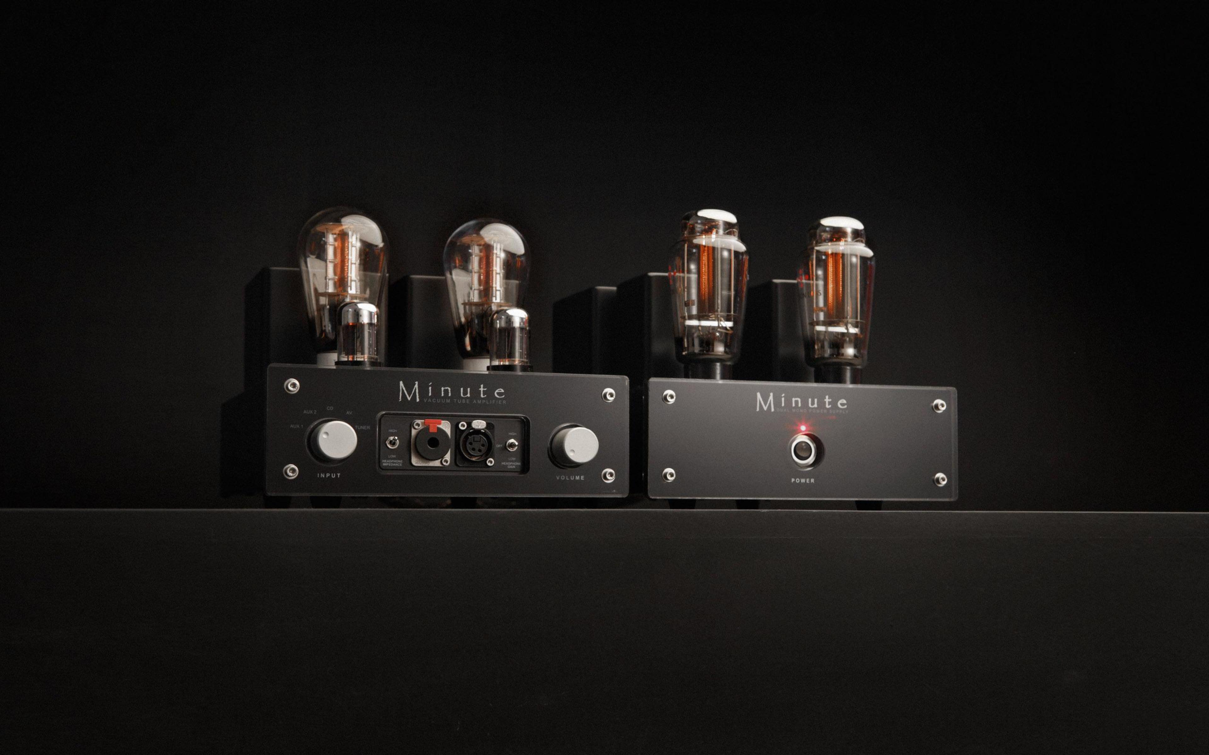 Description: A couple of different types of electronic equipment on a shelf in a room with black walls and black flooring.