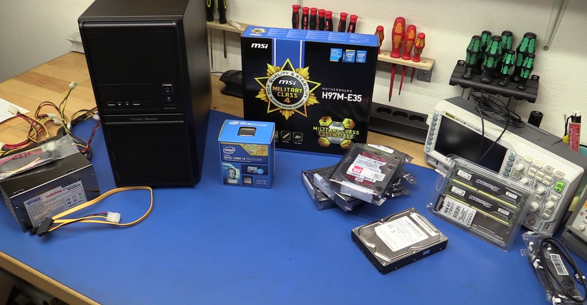 Description: A table with a lot of electronics on it and a phone on it and a laptop on top of it.
