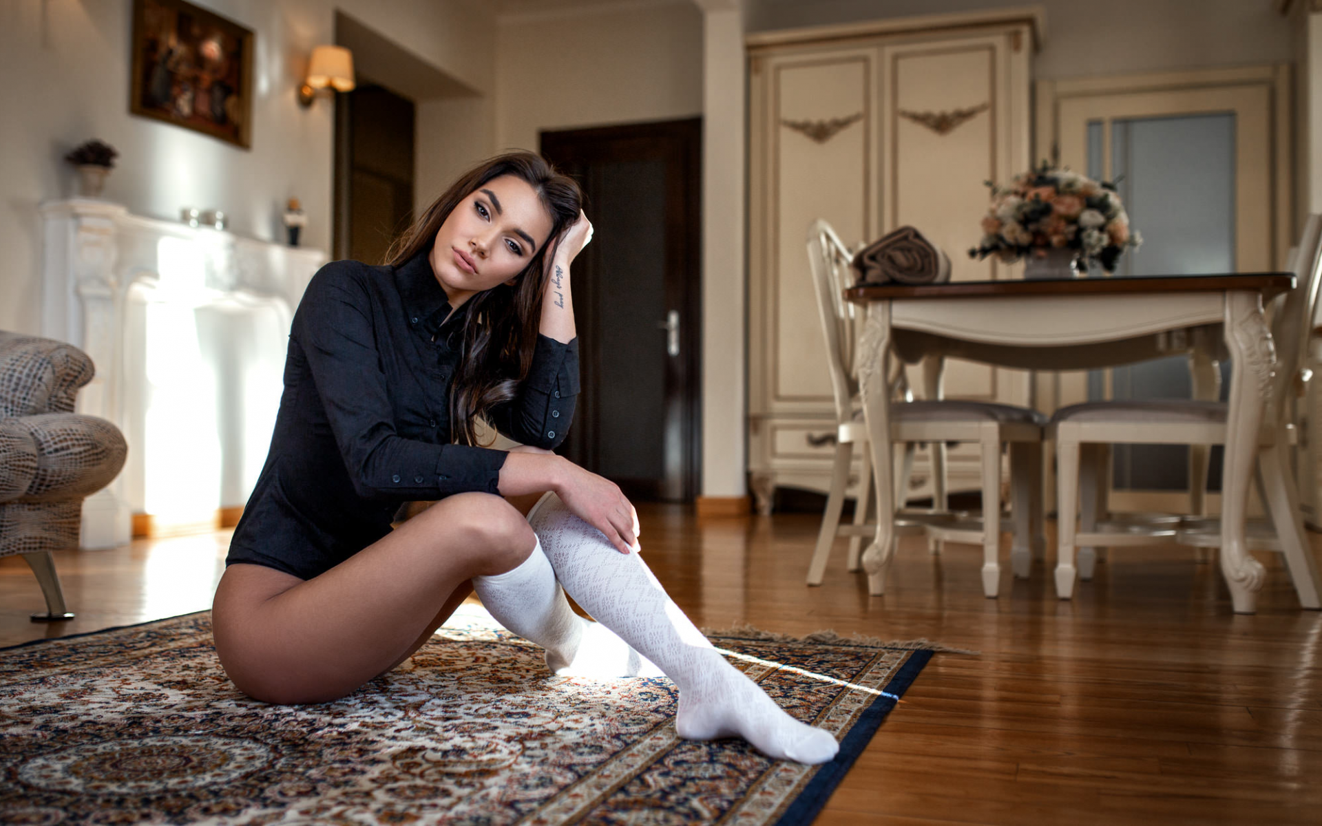 Description: A woman sitting on a rug in a room with a table and chairs in the background and a rug on the floor.