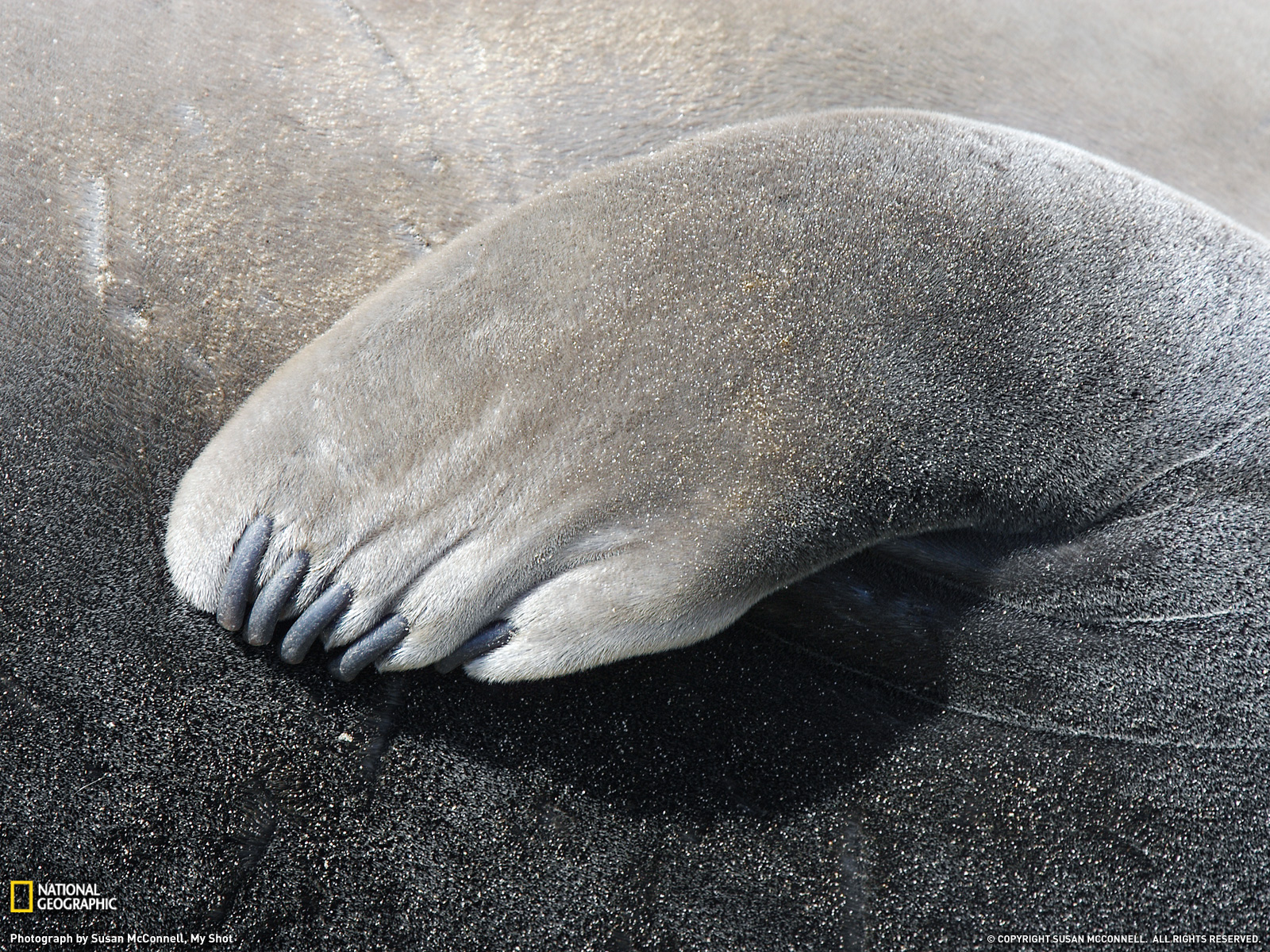 Description: A close up of a elephant's foot on a black ground with sand and water around it and a black background.