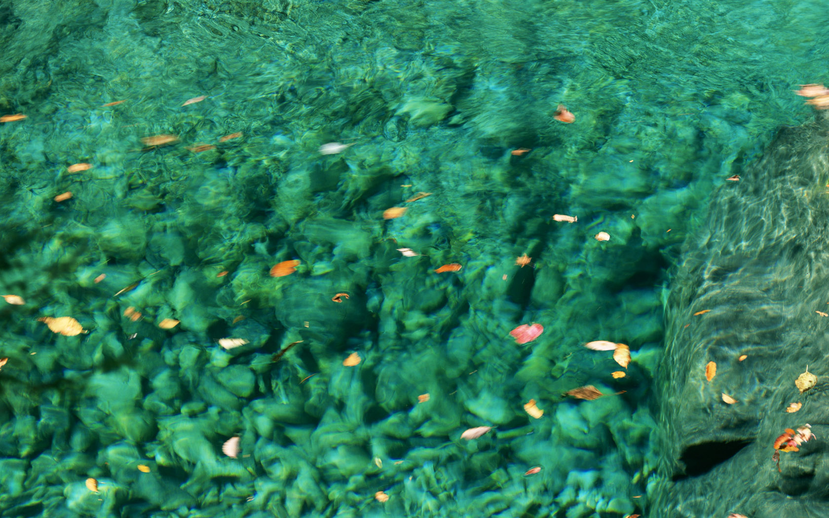 Description: A large elephant standing in a body of water with a bird flying over it's head and a body of water below.