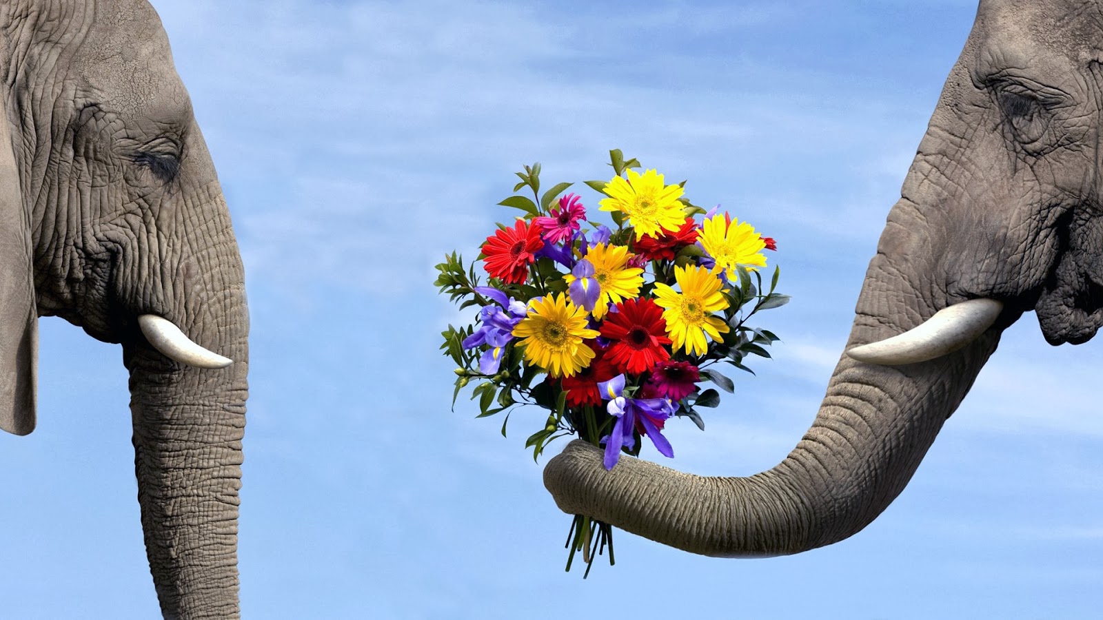 Description: Two elephants with flowers in their trunks facing each other with a sky background behind them and a blue sky.