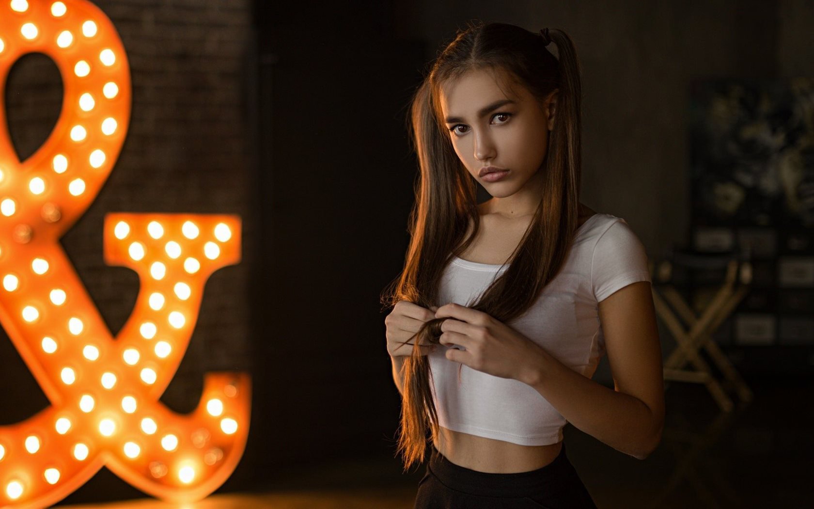 Description: A woman standing in front of a large light up amp sign with a light up amp sign behind her.