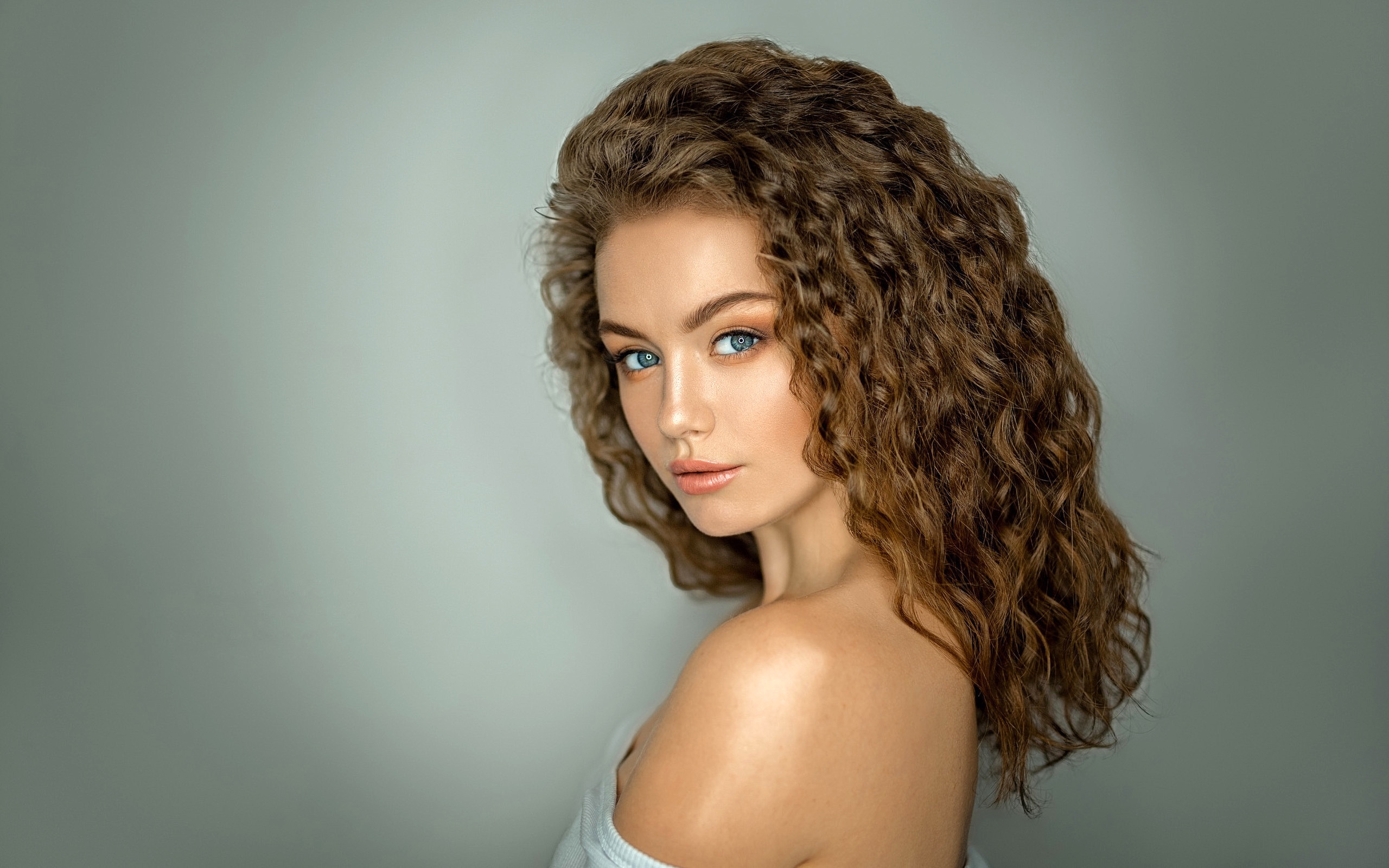 Description: A woman with curly hair is posing for a picture with a gray background and a gray background behind her.