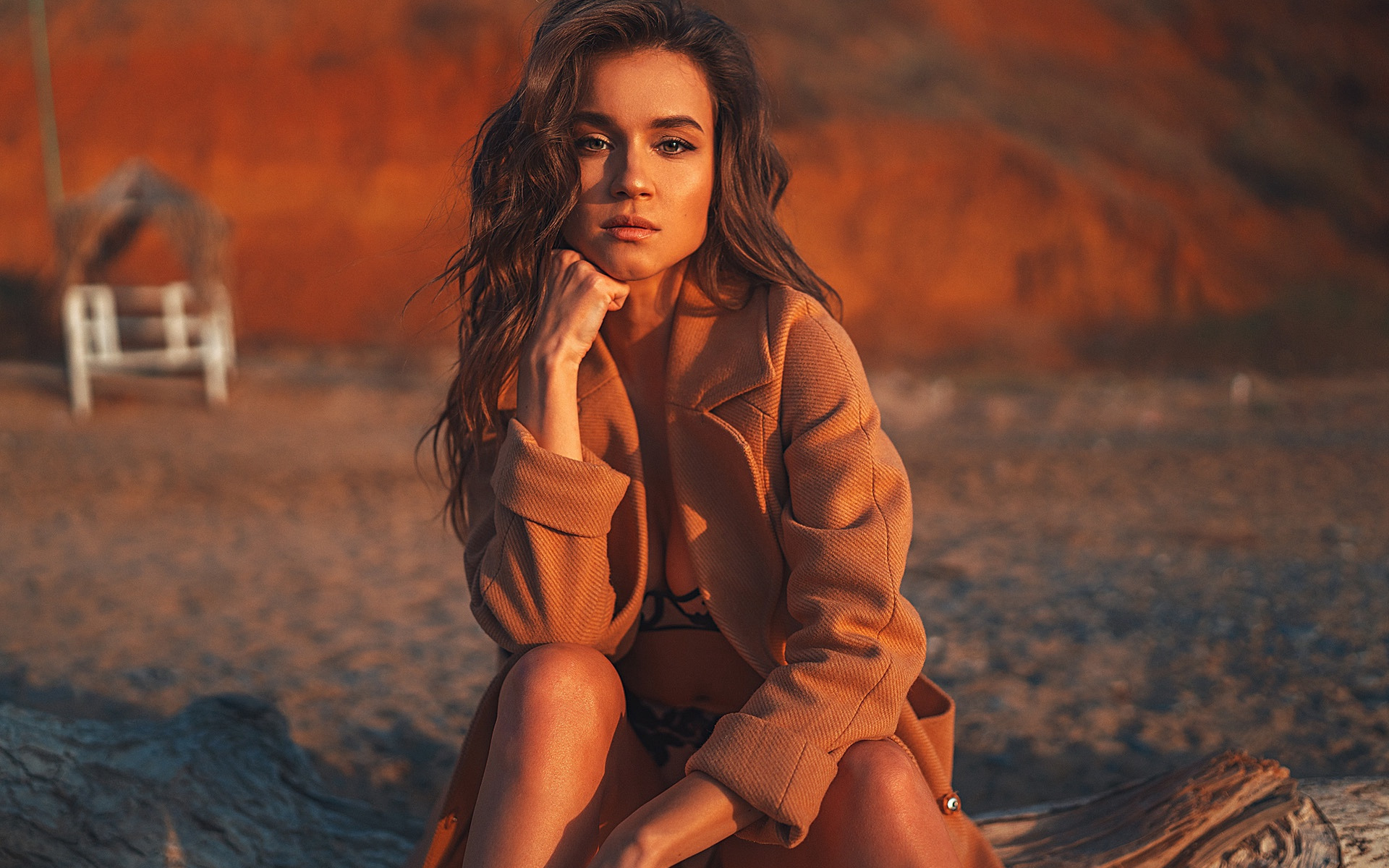 Description: A woman sitting on a log in a desert setting with a chair in the background and a red wall behind her.