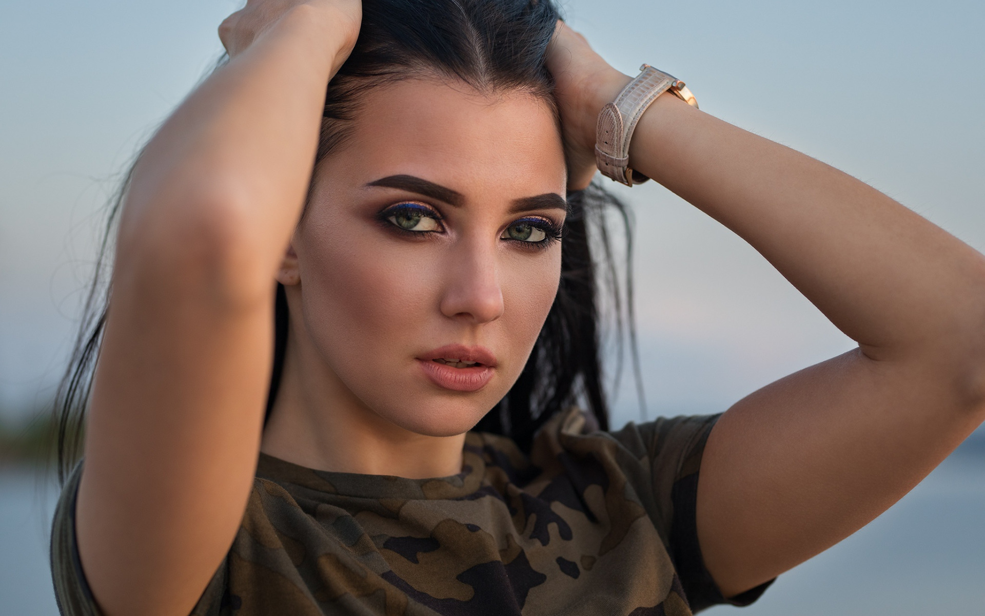 Description: A woman with a green eye makeup and a bracelet on her head is posing for a picture with her hands on her head.