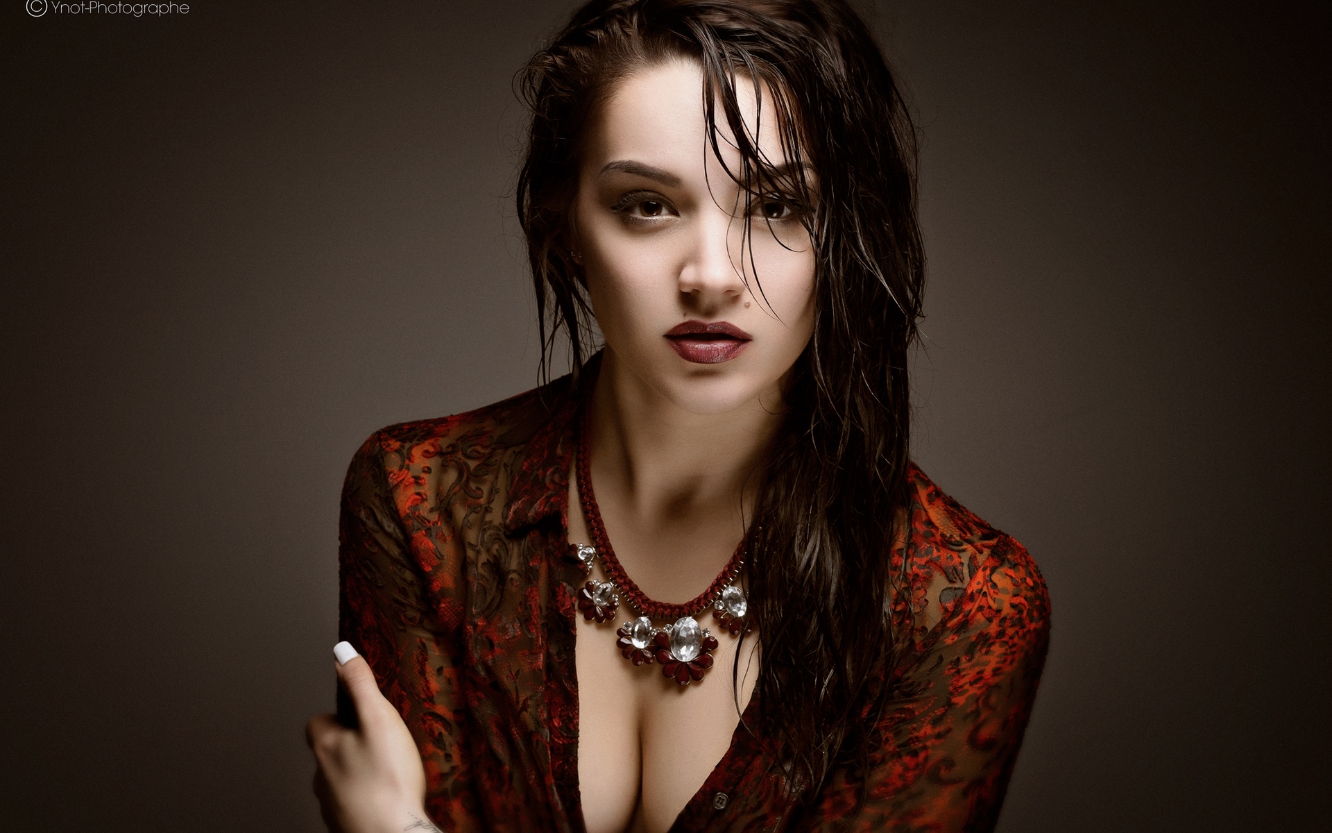 Description: A woman with a necklace and a cigarette in her hand and a shirt on her chest and a cigarette in her hand.