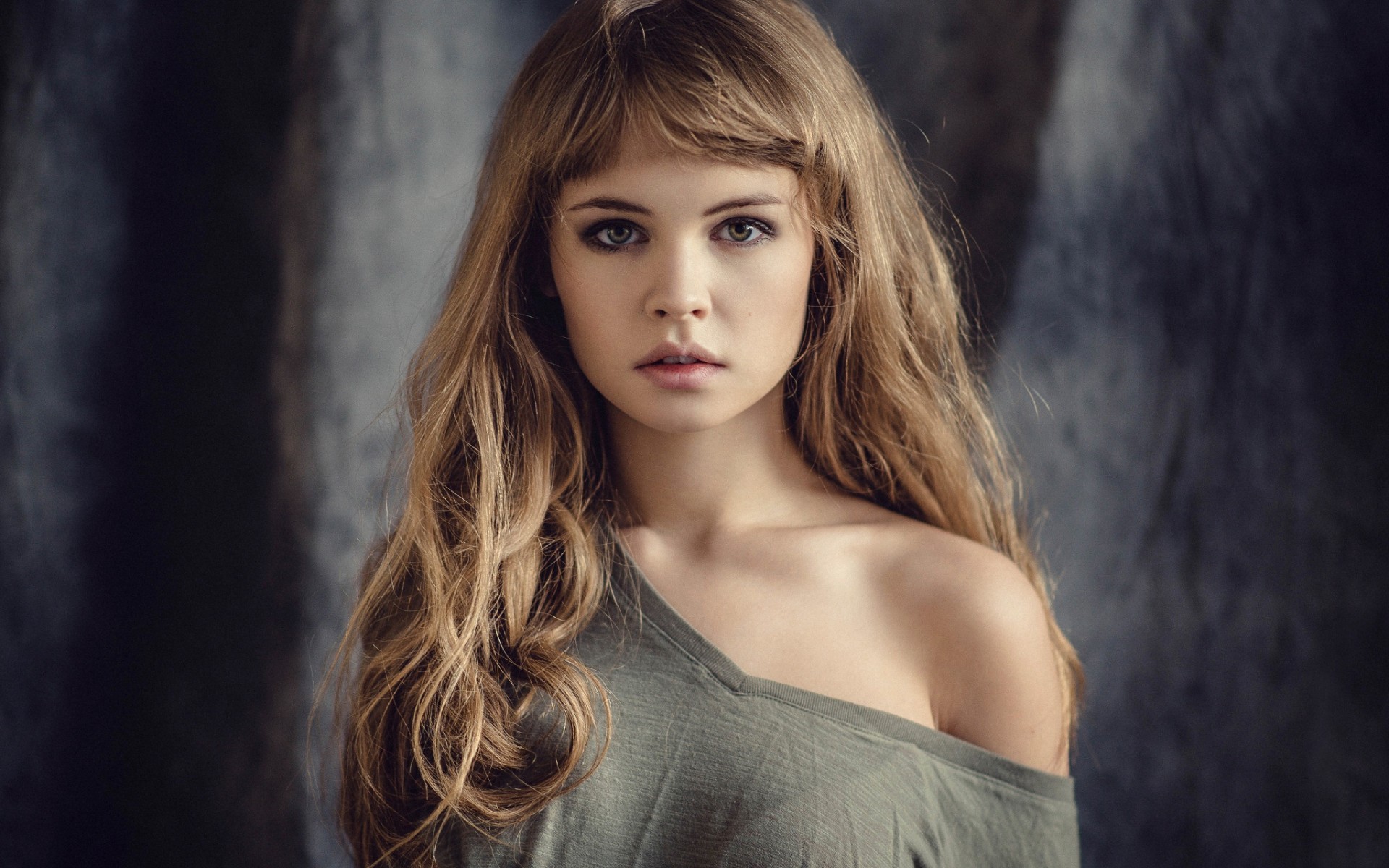 Description: A woman with long hair posing for a picture in a studio setting with a black background and a black backdrop.