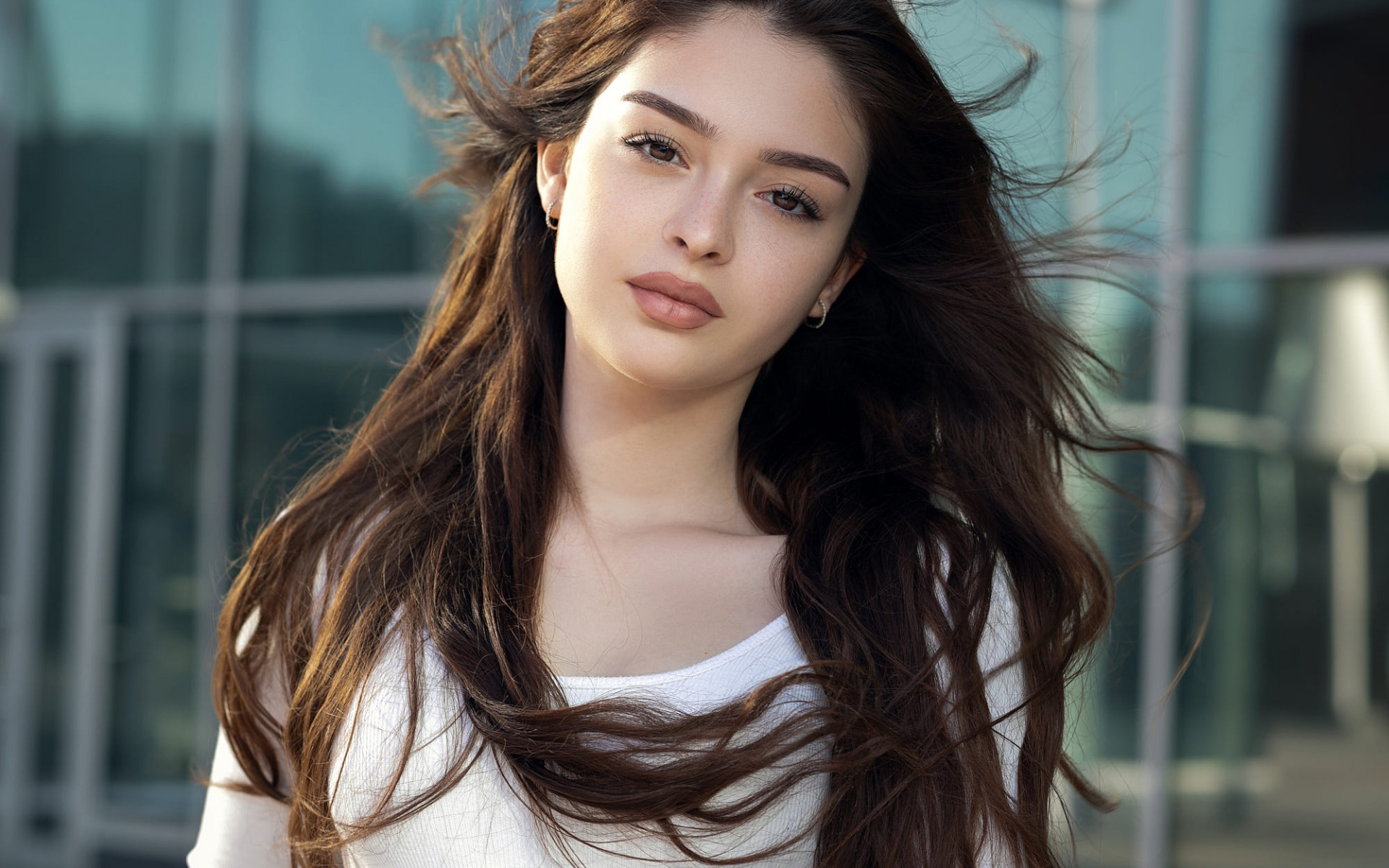 Description: A woman with long hair standing in front of a building with a glass wall behind her and a large pair of earrings on her ear.