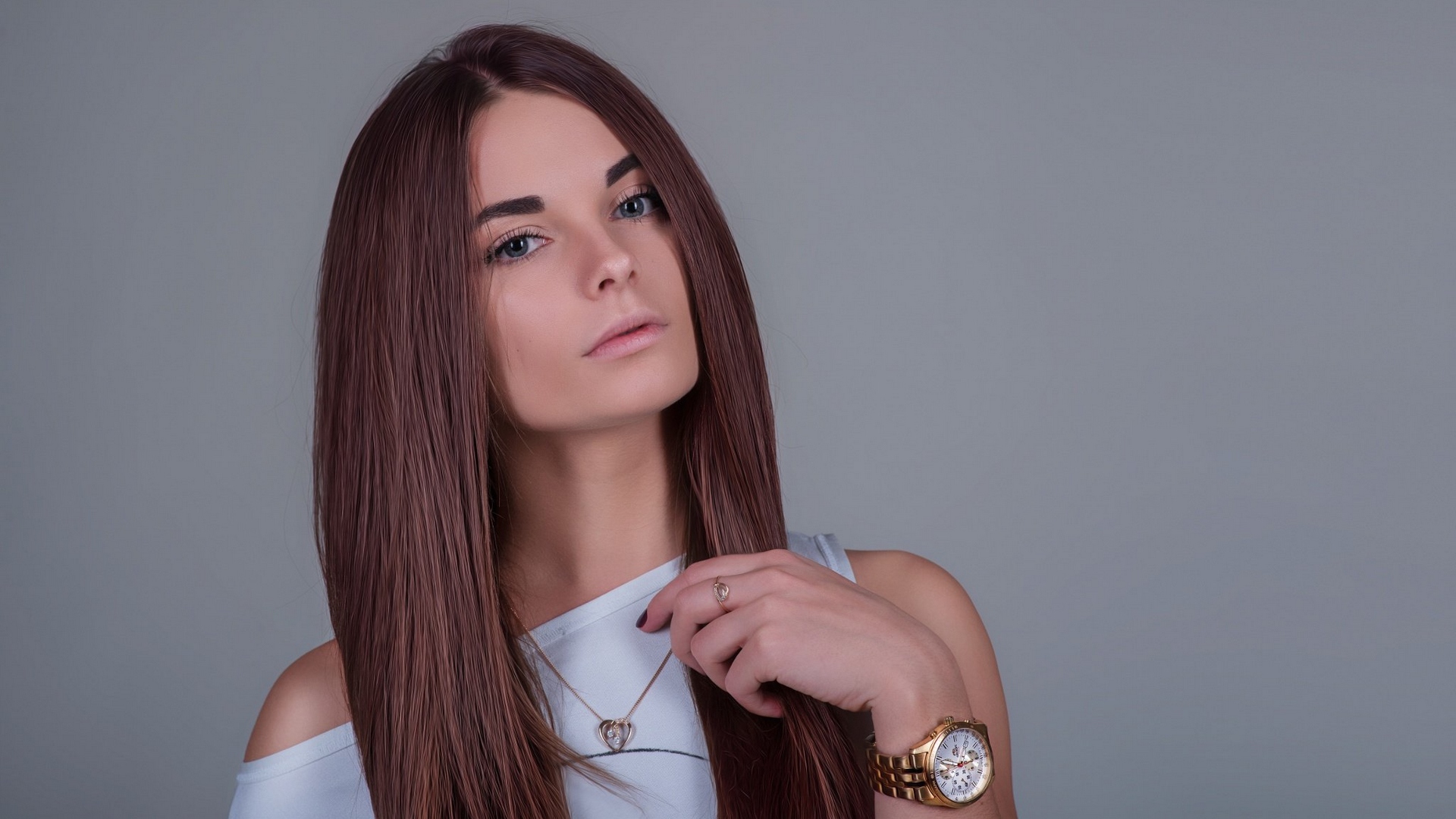 Description: A woman with long hair wearing a watch and a white top is posing for a picture with her hand on her shoulder.
