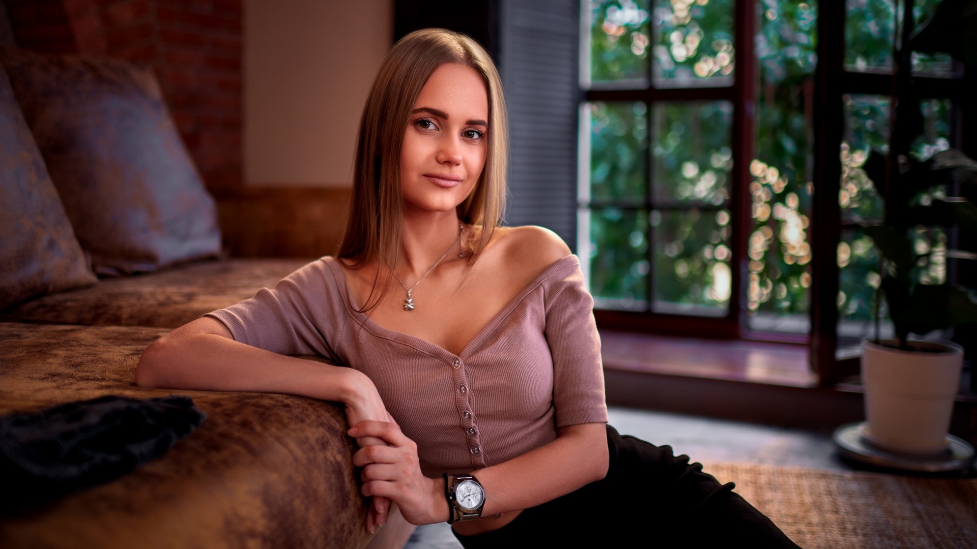 Description: A woman sitting on a couch in a room with a window behind her and a plant in the corner.