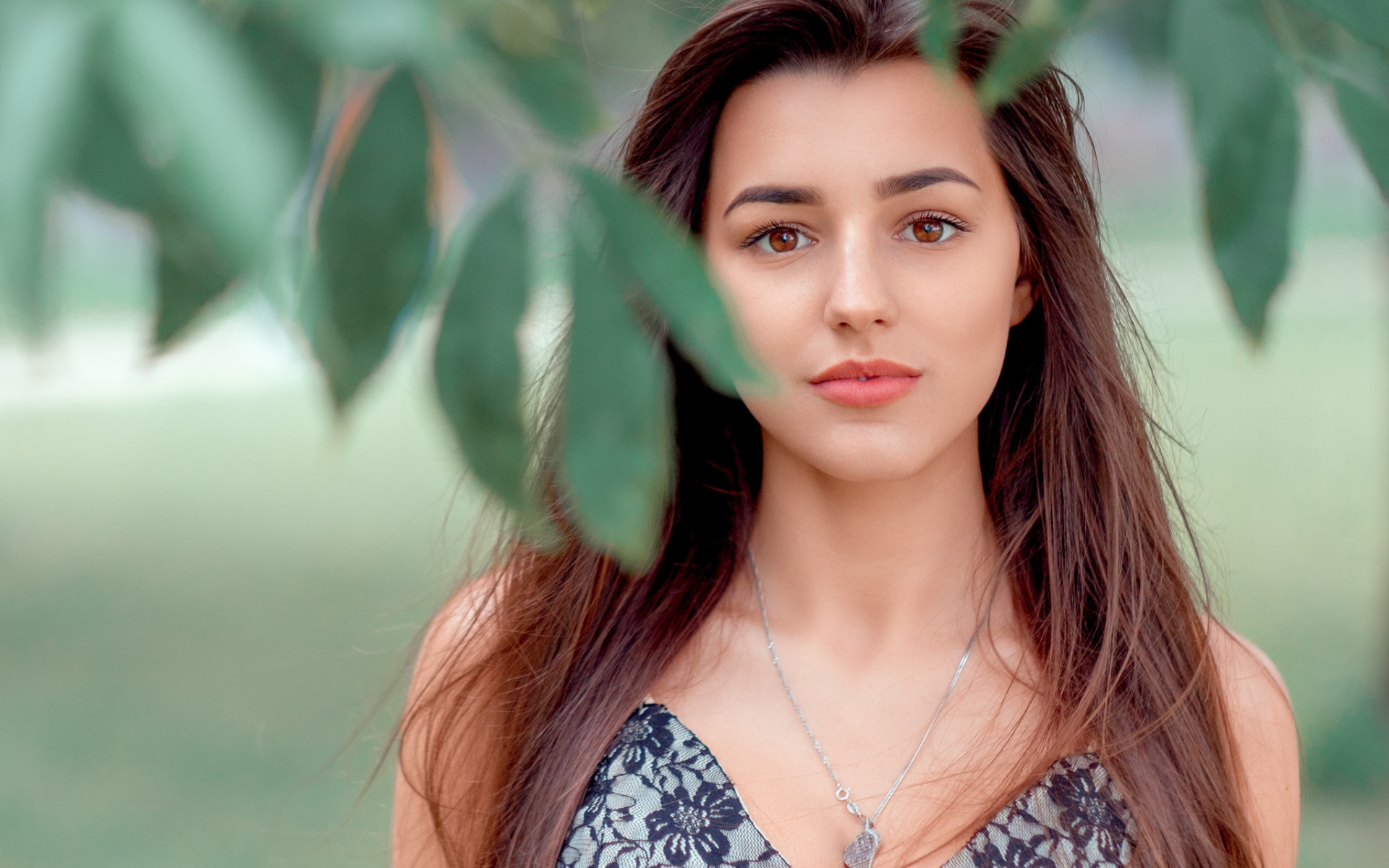 Description: A woman with long hair standing under a tree branch with a green leafy branch in the background and a green grass area behind her.