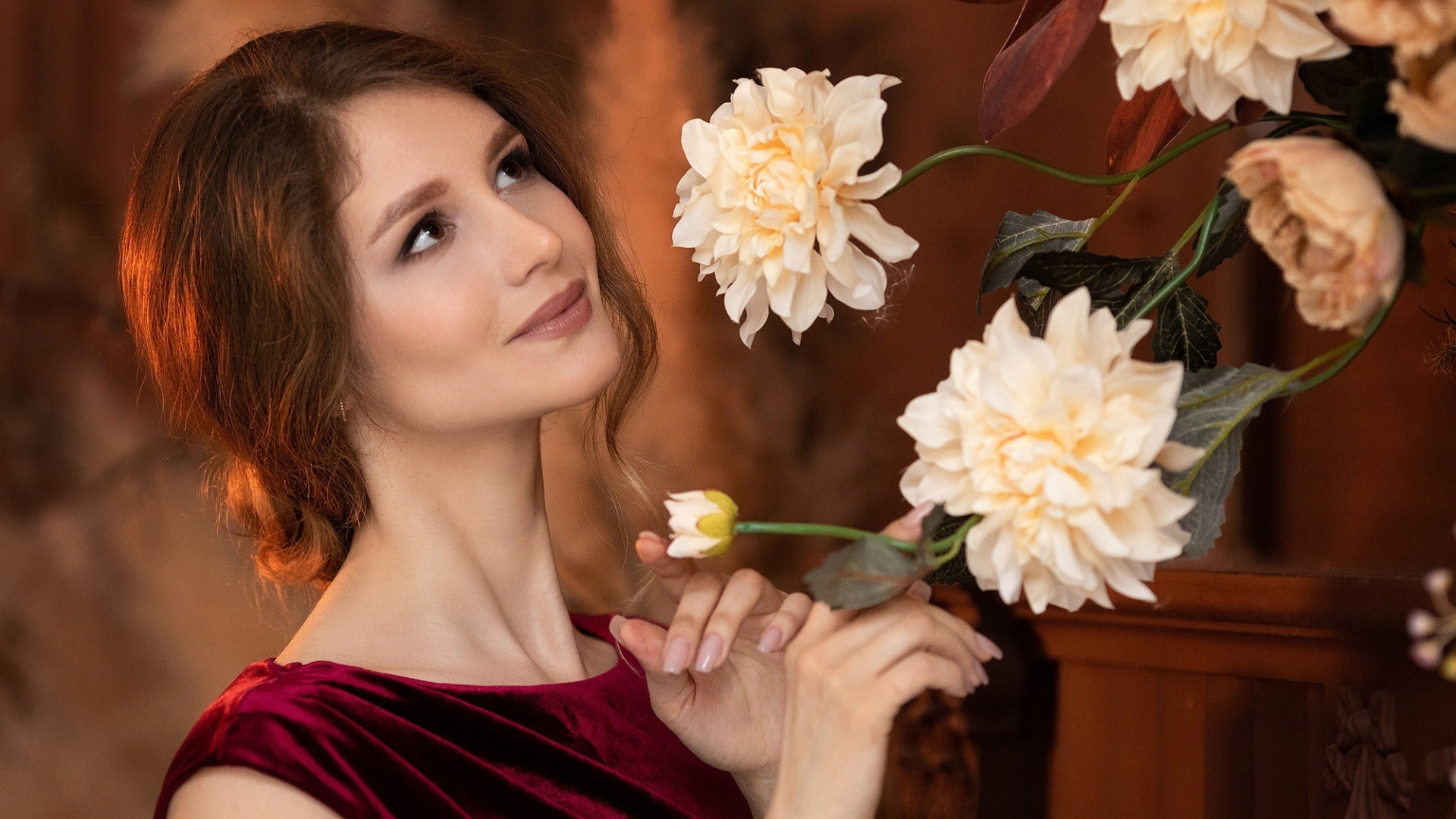 Description: A woman in a red dress holding a flower in her hand and looking up at the sky with a smile on her face.
