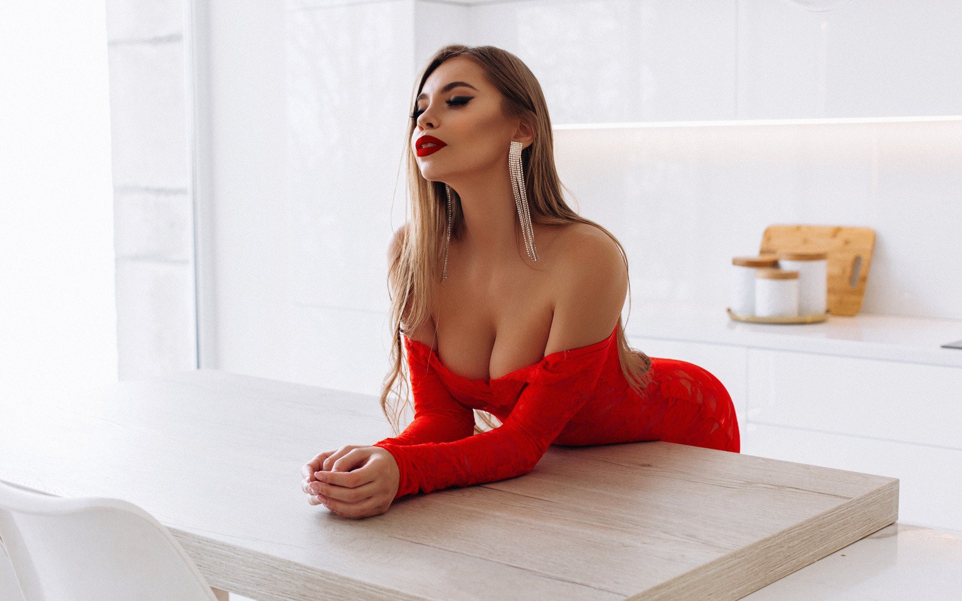Description: A woman in a red dress sitting at a table with her hands on her knees and her legs crossed.