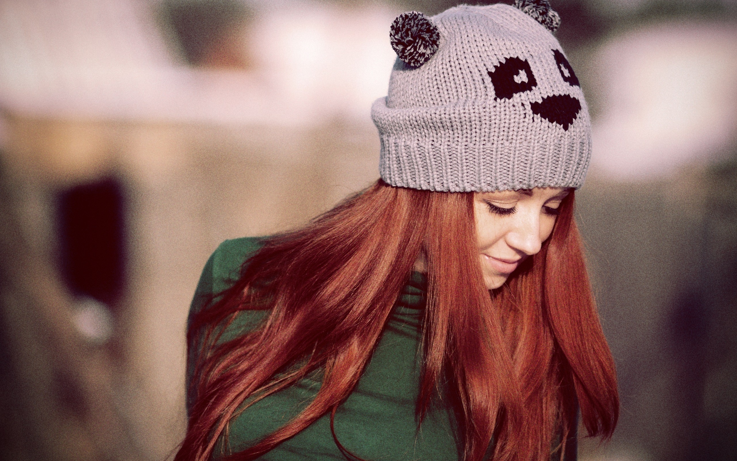 Description: A woman with red hair wearing a knitted hat with a panda face on it and a cell phone.