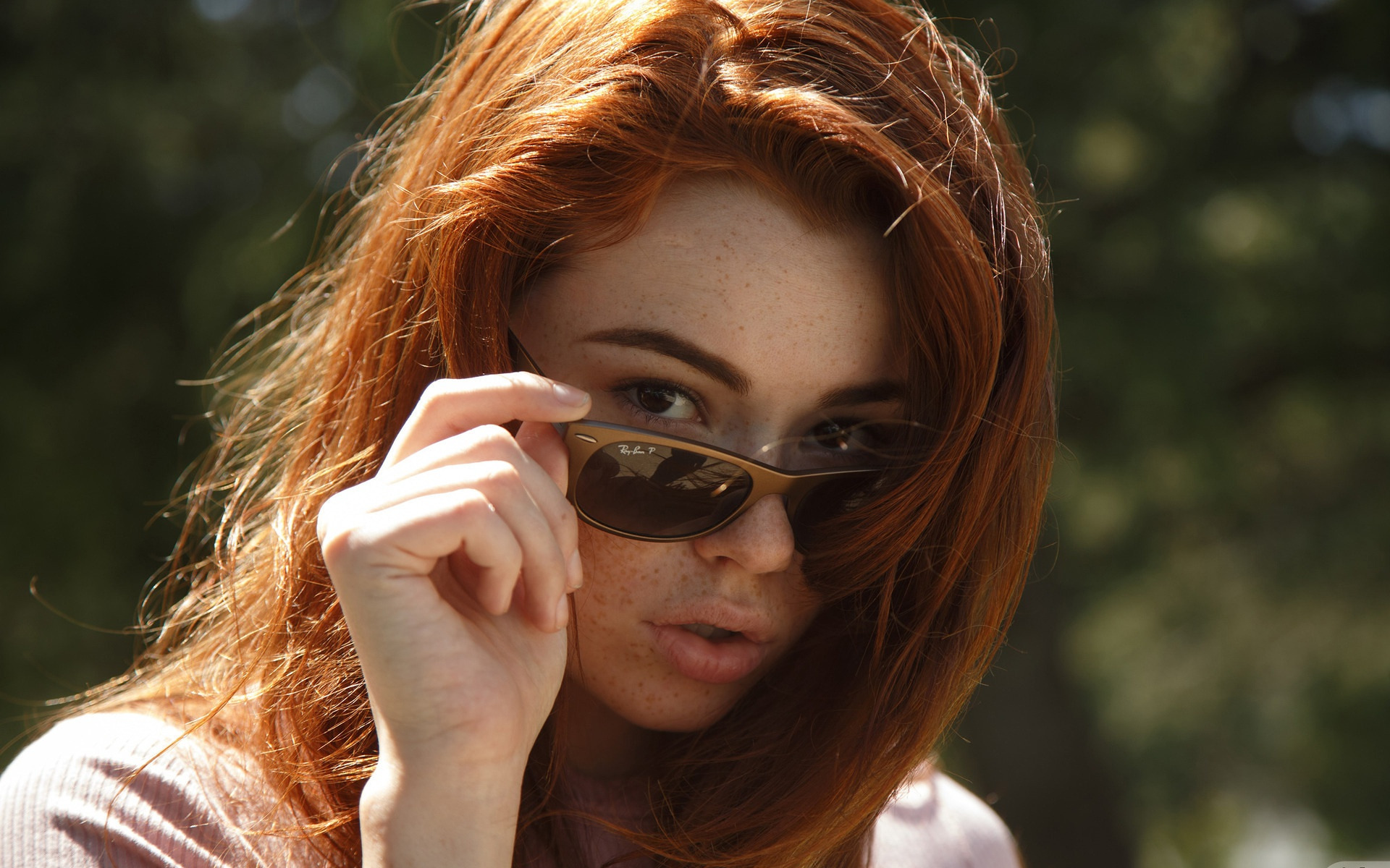 Description: A woman with red hair and sunglasses on her face looking at the camera with a serious look on her face.