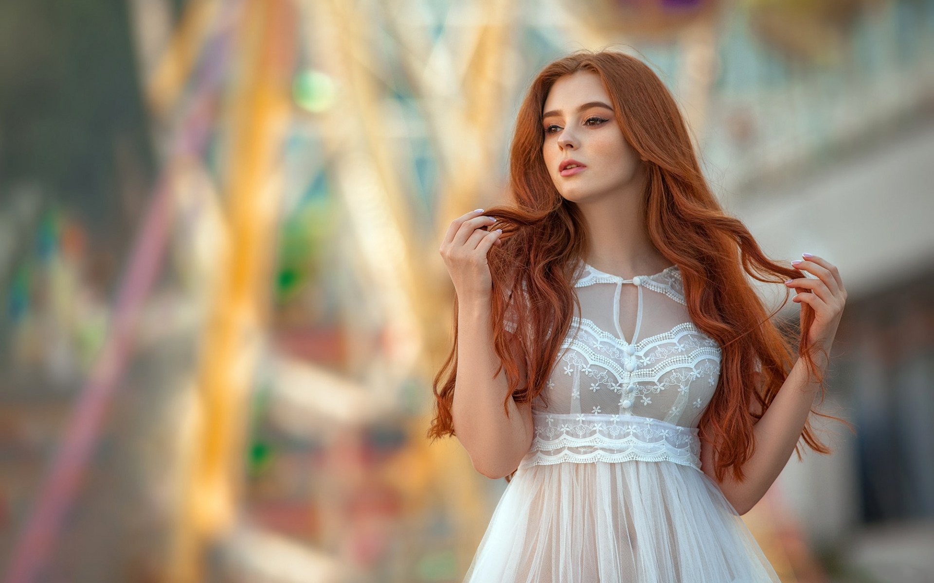 Description: A woman with long red hair wearing a white dress and posing for a picture in front of a carnival ride.