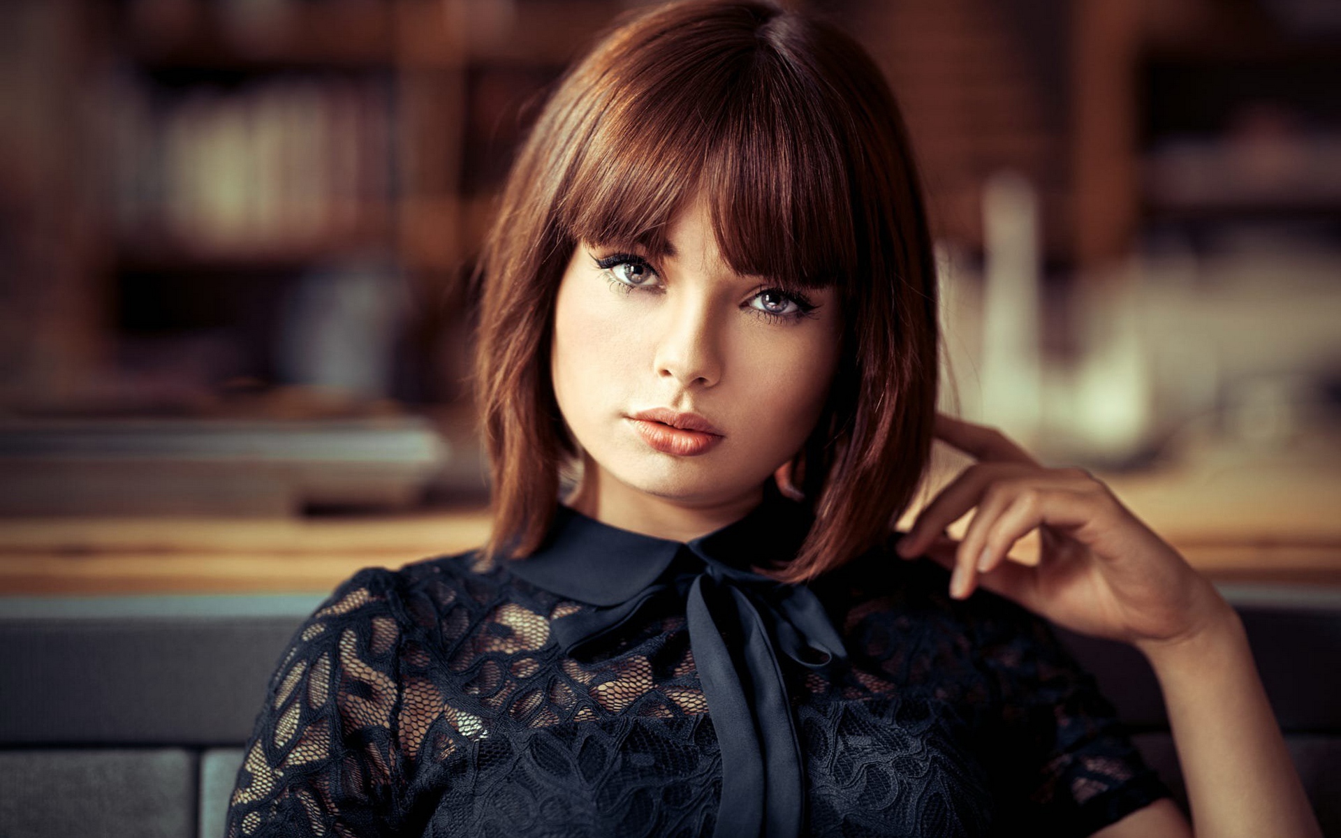 Description: A woman with a black shirt and a bow tie on her neck posing for a picture in a restaurant.