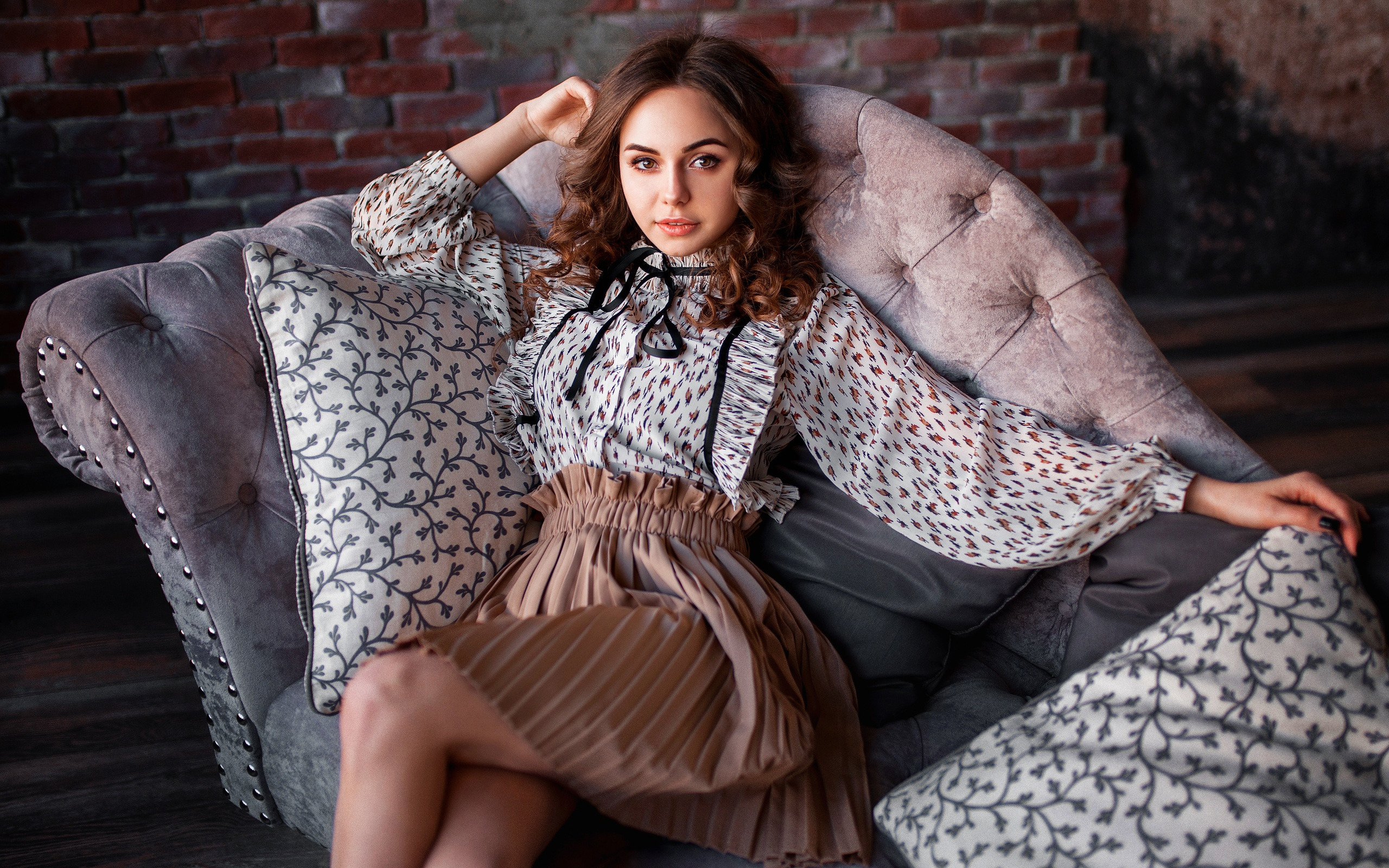 Description: A woman sitting on a couch with a skirt on and a jacket on her shoulders and a shirt on.