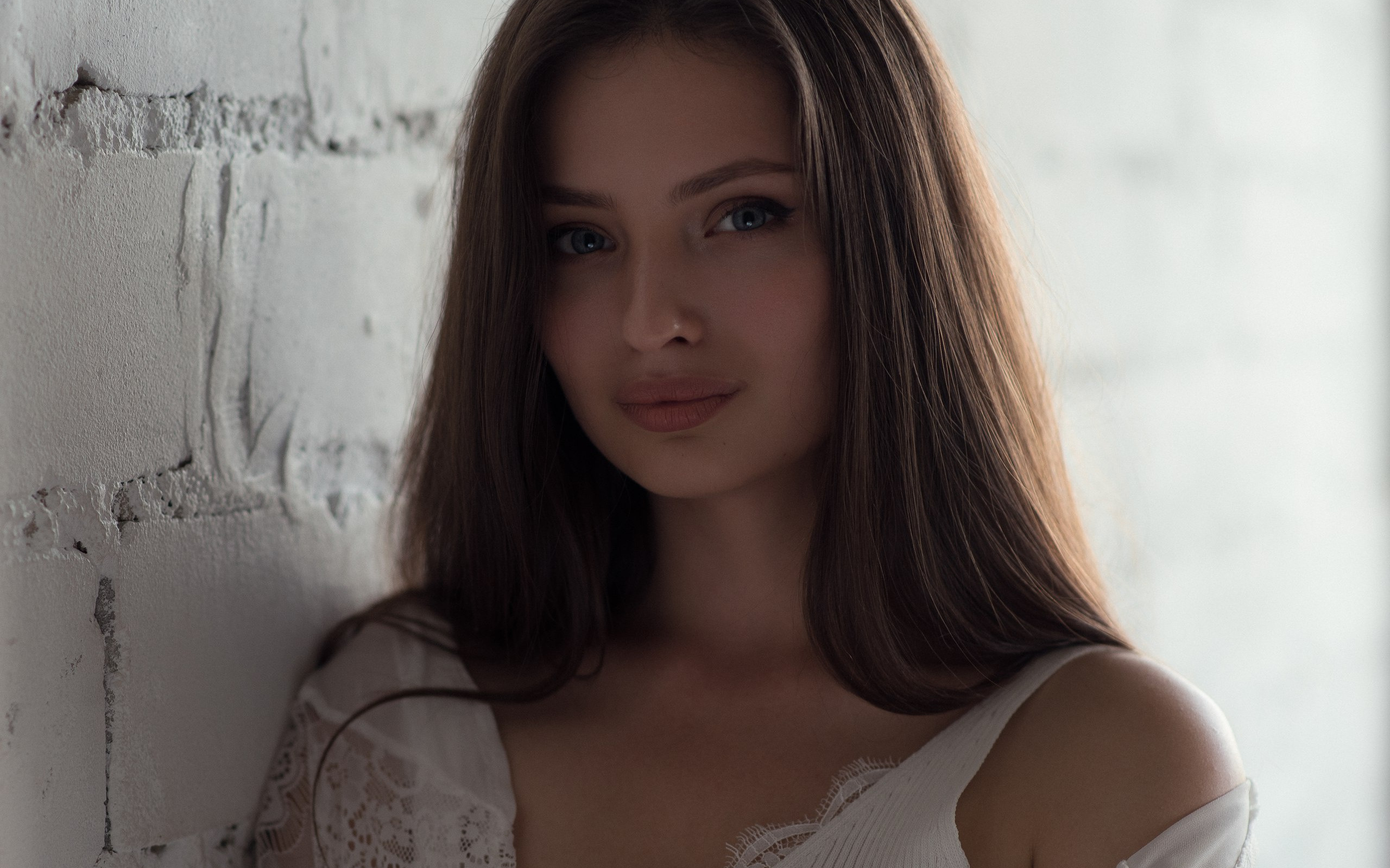 Description: A woman with long hair standing next to a brick wall with a white shirt on and a white shirt on.