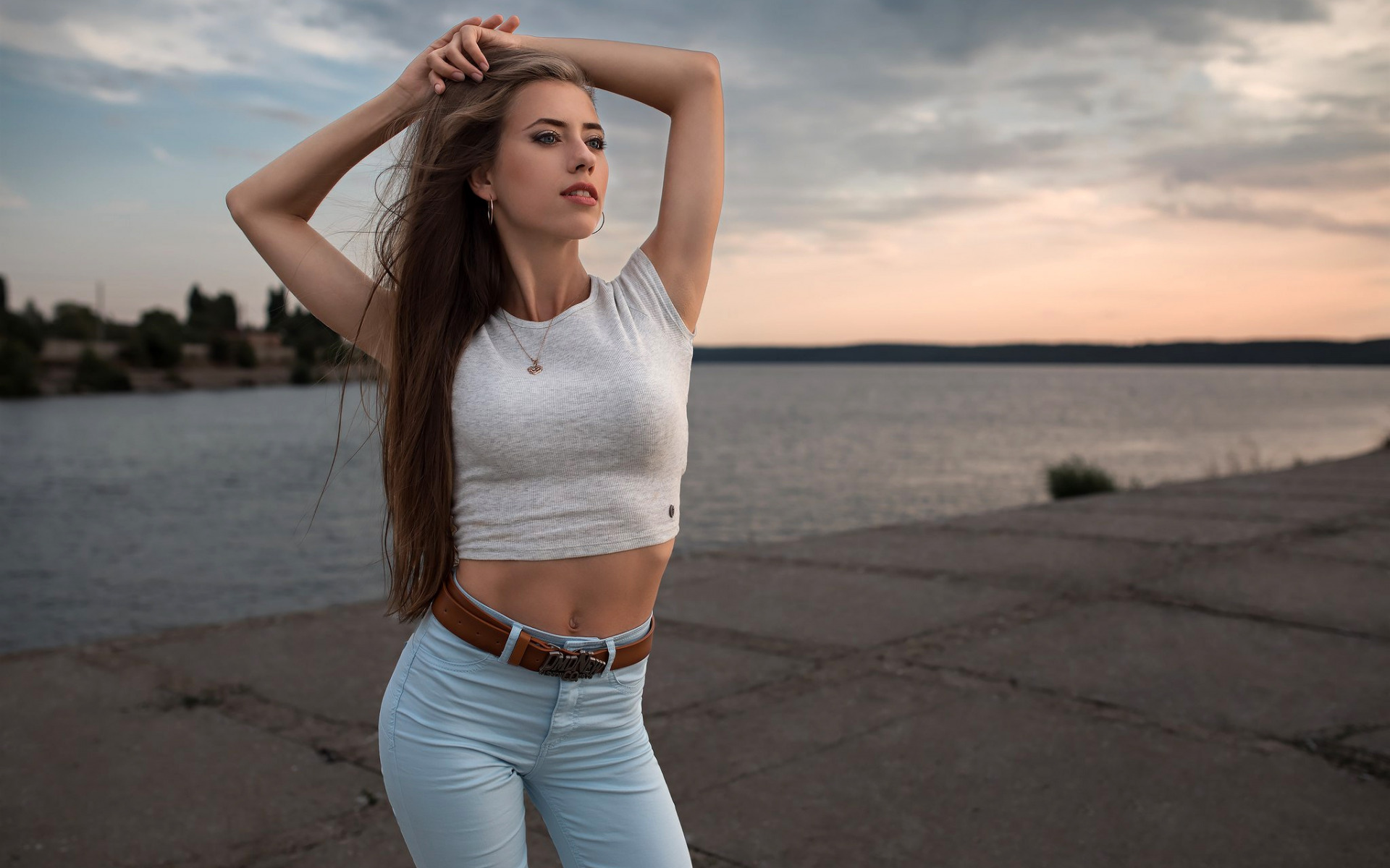 Description: A woman with long hair standing near the water at sunset or sunset time.