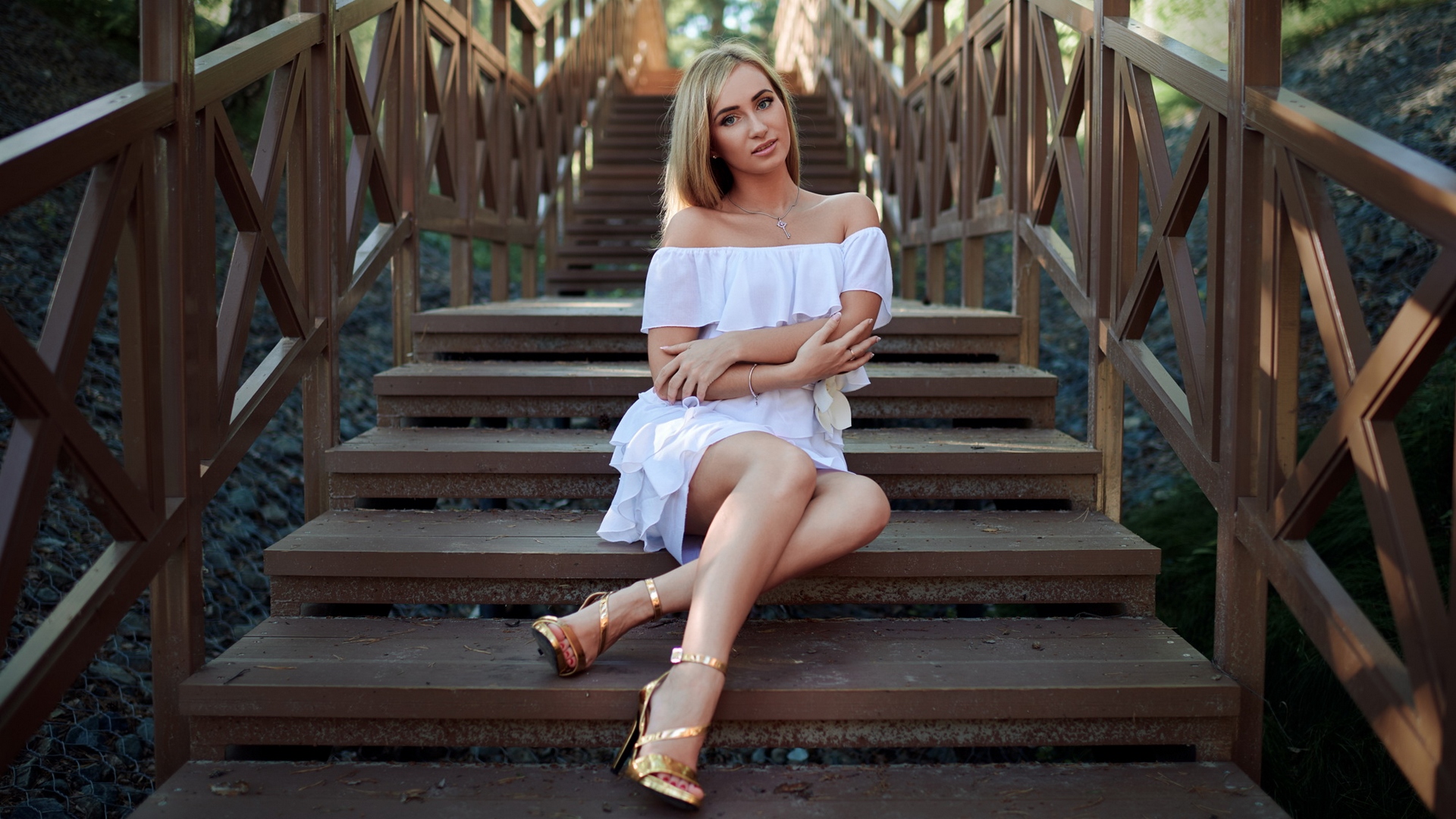 Description: A woman sitting on a set of stairs wearing a white dress and gold shoes with her arms crossed and legs crossed.